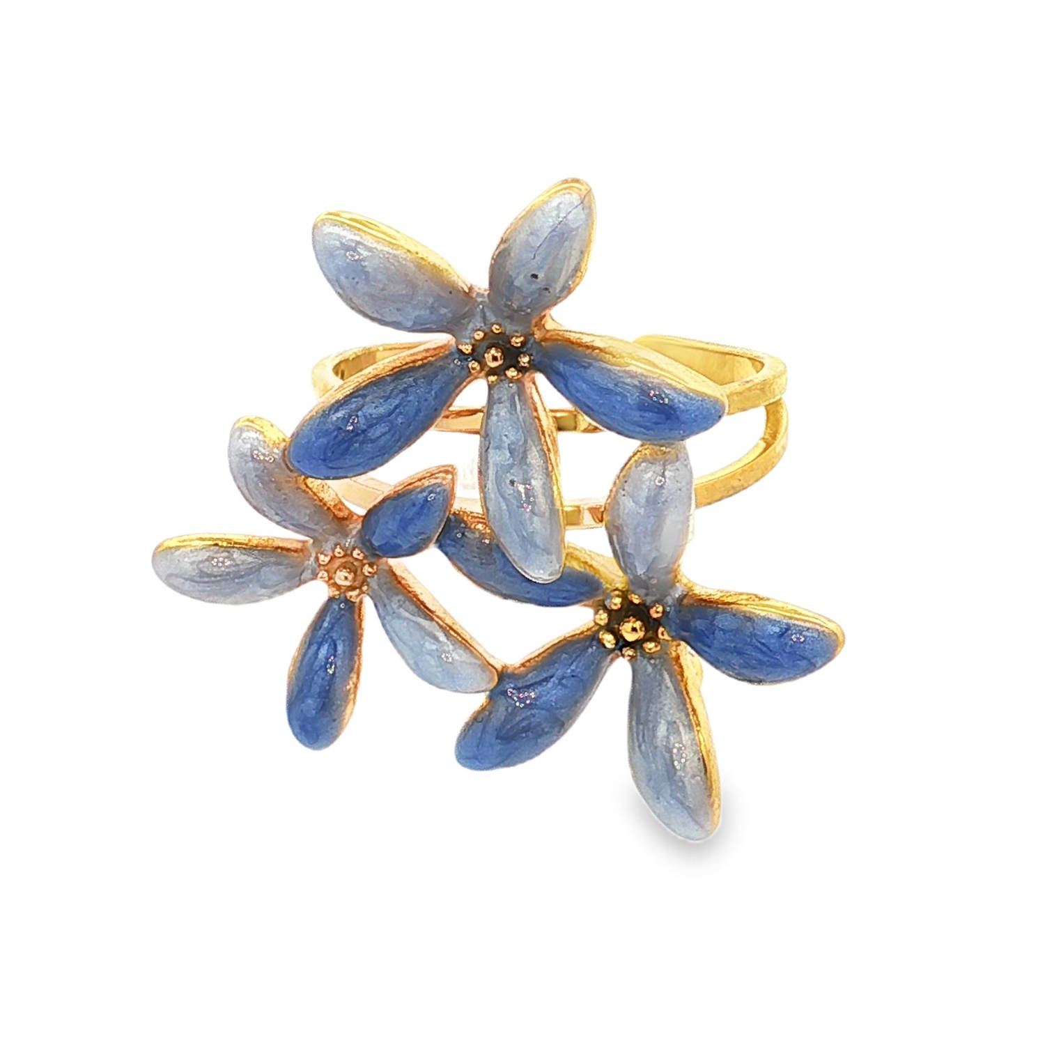 Trois fleurs délicatement ciselées s'entrelacent pour former un bouquet harmonieux. Chaque pétale est orné d'un dégradé de bleu nacré et de bleu azur, créant un effet de profondeur et une brillance subtile.