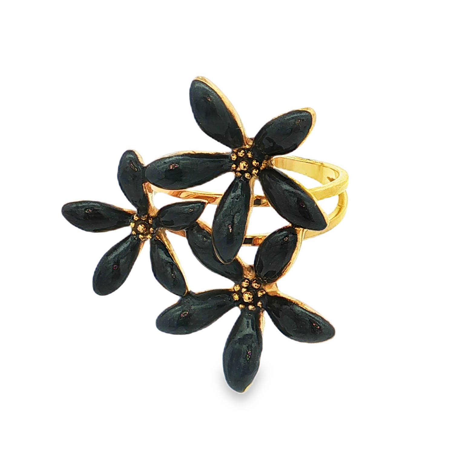 Cette bague en acier inoxydable doré se distingue par son bouquet de trois fleurs stylisées. Chaque fleur est parée d'un émail noir brillant, créant un contraste saisissant avec les reflets chauds de la monture dorée.