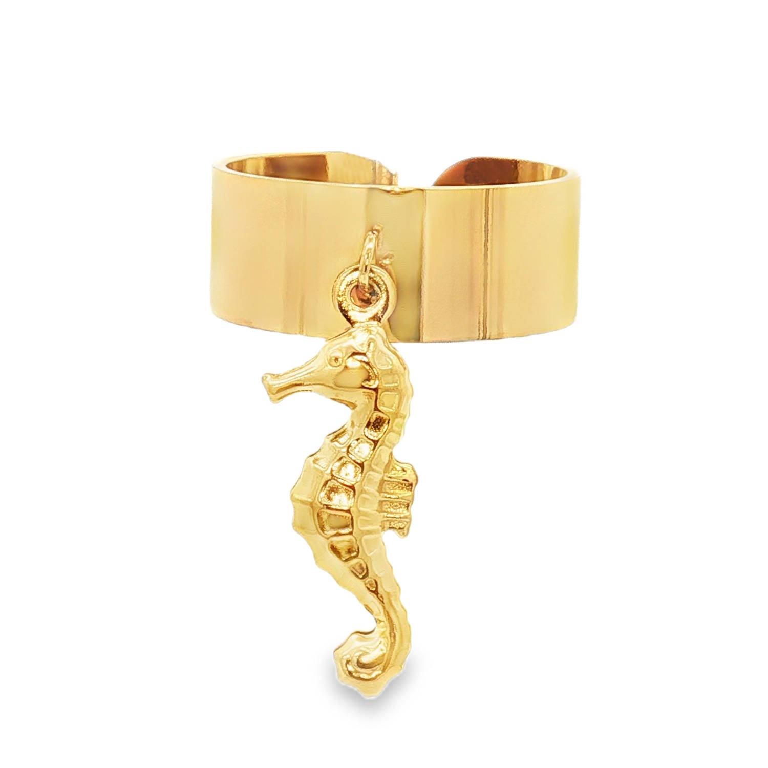 Description Affirmez votre style avec cette bague audacieuse qui capture l'esprit de l'océan. Ce bijou se distingue par son design moderne et ludique, combinant la force d'un anneau large avec la finesse d'un pendentif mobile. Un pendentif en forme d'hippocampe finement détaillé, suspendu à un petit anneau central. Il bouge au gré de vos mouvements, apportant une touche dynamique et originale à votre main. Une bande large en acier doré à la finition polie miroir pour un éclat maximal. Sa structure ouverte à l'arrière permet un ajustement léger pour s'adapter parfaitement à votre doigt. Largeur 8 mm Matière(s) Acier . L'acier utilisé dans la bijouterie existe sous plusieurs qualités. Nous utilisons principalement la qualité 316L, qualité qui est utilisée en chirurgie. Cet acier est donc inoxydable et reste très résistant. Fermoir Aucun À noter Pendentif 8x20 mm Couleur(s) dominante(s) Doré Public Adolescent , Adulte . Genre Femme , Fille . Saison Eté , Printemps . Thème(s) Animaux , Nature . Collection Seaside Cliquez sur une matière, un thème, une couleur ou une collection pour voir tous les articles associés.