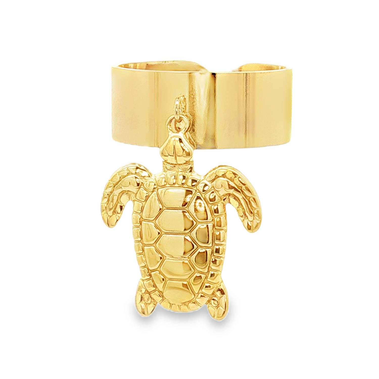 Description Cette bague en acier doré originale allie un design moderne à une touche de fantaisie marine. L’originalité de ce bijou réside dans son charm en forme de tortue de mer, suspendu délicatement à l’anneau. Elle bouge au rythme de vos mouvements, apportant une dynamique ludique à votre main. La tortue présente des finitions soignées, avec une carapace texturée et des détails gravés sur les nageoires, créant un contraste saisissant avec le lissage de l'anneau. Sa structure est ajustable grâce à son ouverture discrète à l'arrière, ce qui permet de l'adapter facilement à différentes tailles de doigts. Largeur 8 mm Matière(s) Acier . L'acier utilisé dans la bijouterie existe sous plusieurs qualités. Nous utilisons principalement la qualité 316L, qualité qui est utilisée en chirurgie. Cet acier est donc inoxydable et reste très résistant. Fermoir Aucun À noter Pendentif 16x21 mm Couleur(s) dominante(s) Doré Public Adolescent , Adulte . Genre Femme , Fille . Saison Eté , Printemps . Thème(s) Animaux , Nature . Collection Seaside Cliquez sur une matière, un thème, une couleur ou une collection pour voir tous les articles associés.