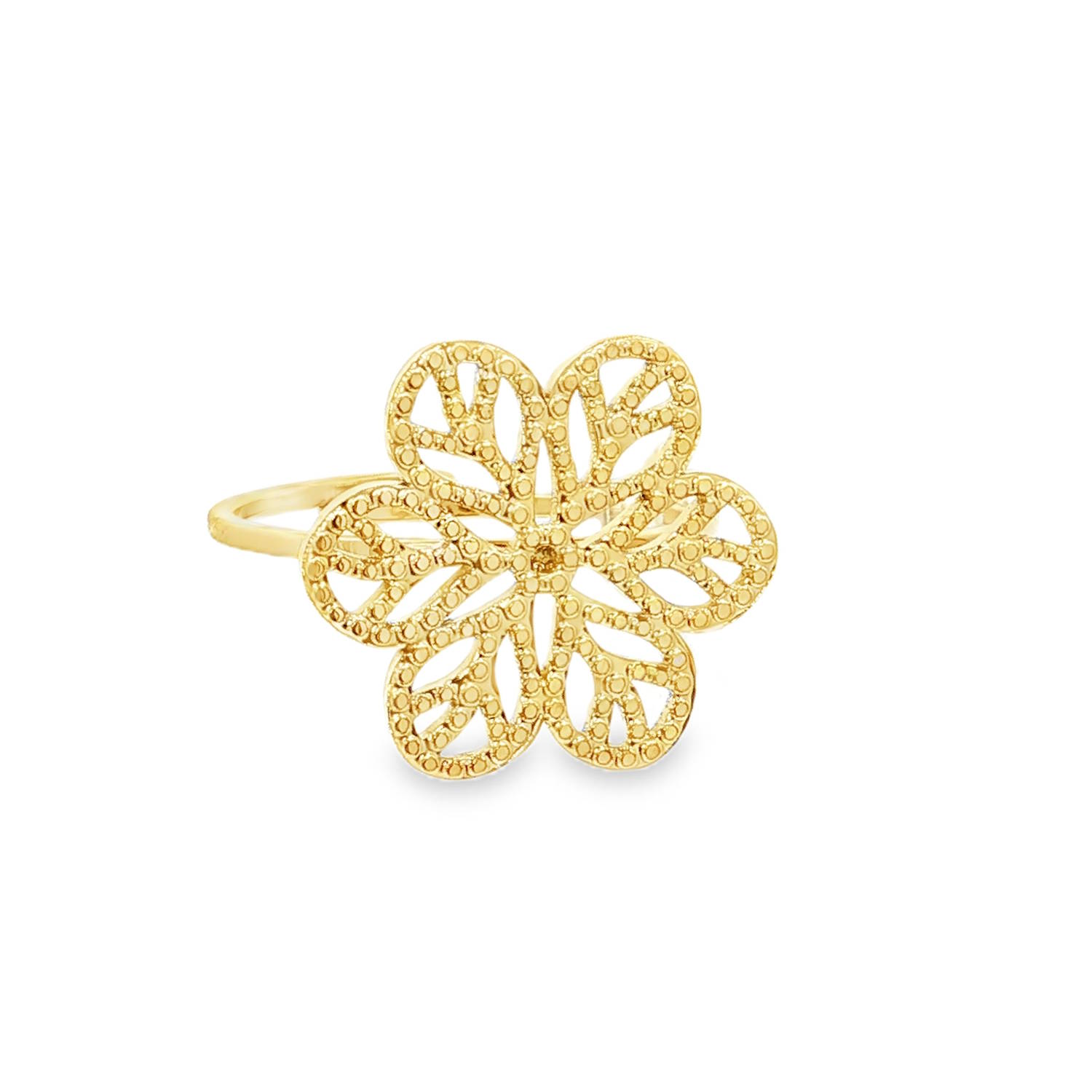 La pièce centrale est une large fleur stylisée composée de six pétales arrondis. Le travail de découpe en filigrane crée un effet de dentelle métallique très aérien.