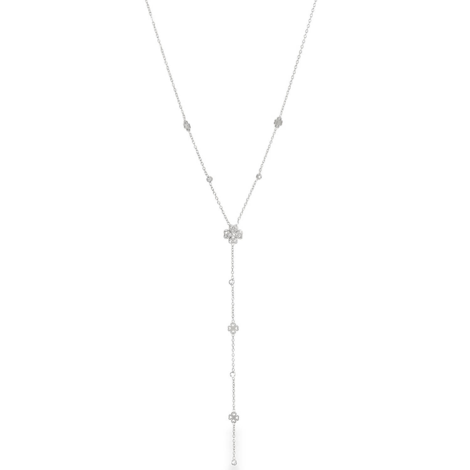 Laissez-vous séduire par la finesse de ce collier cravate en acier inoxydable, une pièce aérienne qui sublime le décolleté avec une grâce infinie. Sa chaîne délicate est ponctuée de petits trèfles stylisés et de cristaux scintillants, menant l’œil vers un motif central pavé de cristaux éclatants.
