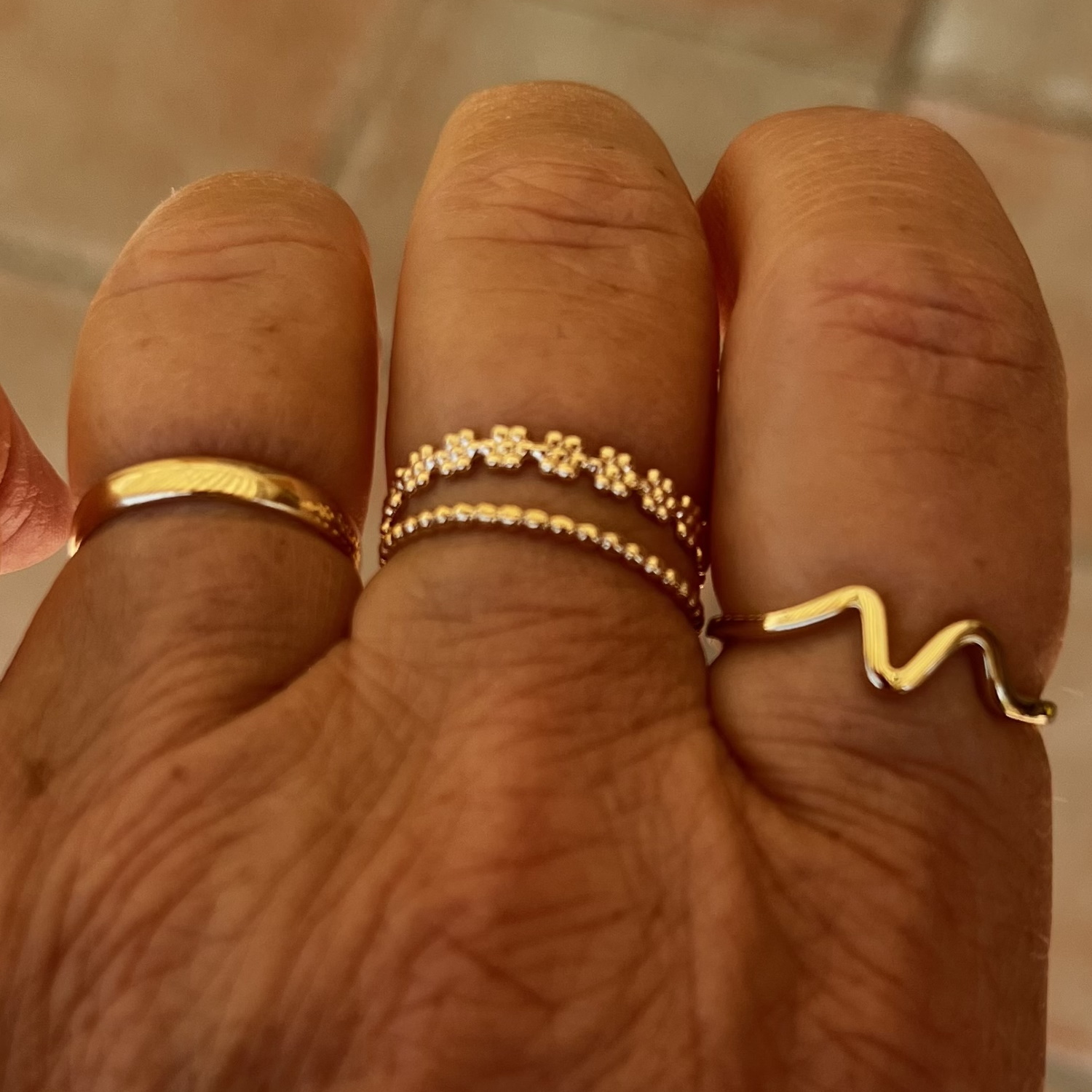 Description Bague fine motif vague en plaqué or 18 carats. Largeur 5 mm Matière(s) Plaqué or . Nos bijoux en plaqué or sont faits sur une base de laiton et recouverts d'or 18 carats à 3 microns sans dispersion. Cela signifie que nous garantissons 3 microns d'or sur n'importe quelle partie du bijou. Sur la plupart de nos bijoux empierrés, nous montons à 5 microns d'or 18 carats. Pour finir, nous faisons également une finition avec de l'or 24 carats afin de donner un plus bel éclat à nos bijoux. Poids d'argent 0,87 gramme(s) Couleur(s) dominante(s) Doré Public Adolescent , Adulte . Genre Femme , Fille . Saison Indémodable . Thème(s) Symboles . Cliquez sur une matière, un thème, une couleur ou une collection pour voir tous les articles associés.
