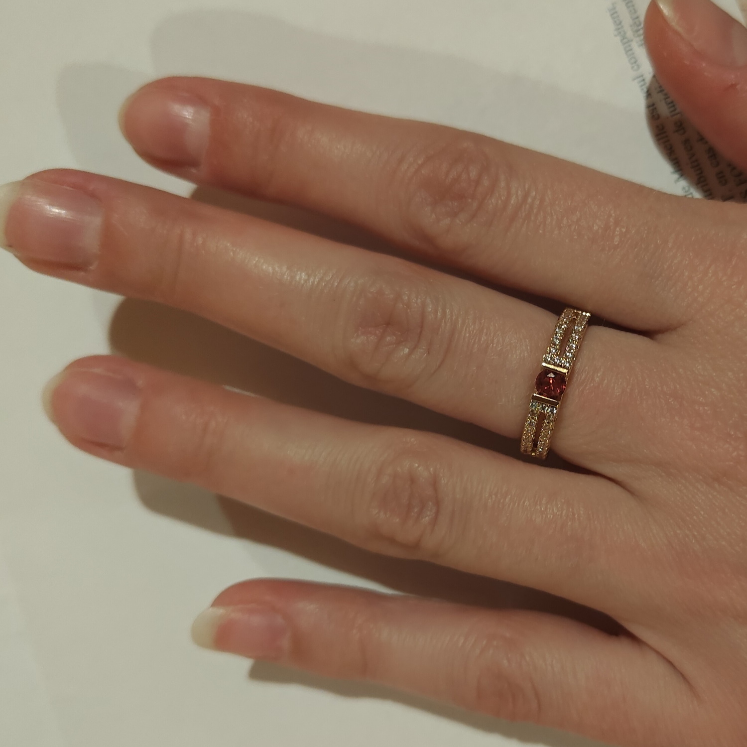 Bague en plaqué or, oxyde de zirconium et verre couleur rubis.