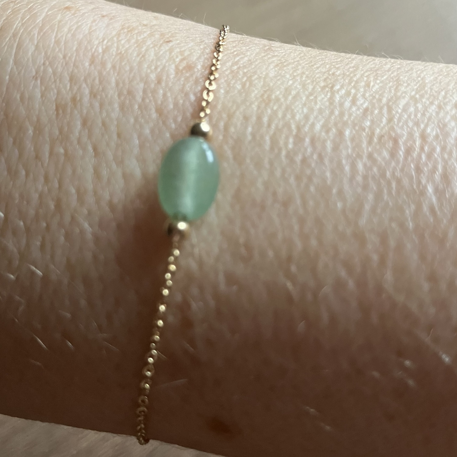 Description Bracelet chaîne en plaqué or jaune 18 carats finissant par une véritable pierre aventurine de forme ovale. Fermoir mousqueton avec anneaux de rappel à 16 cm et rallonge de 4 cm. pierre d'aventurine verte.