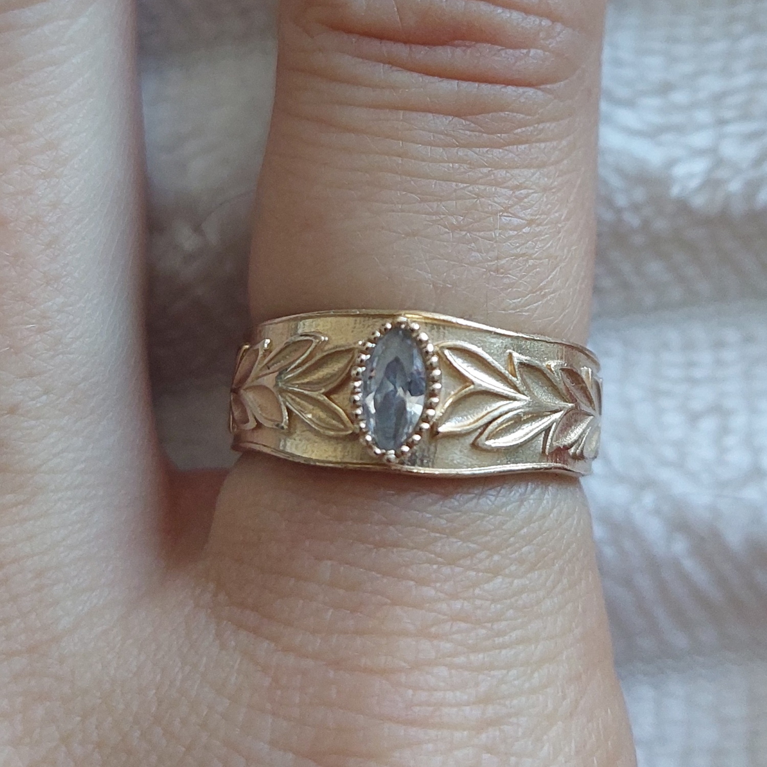 Bracelet jonc rigide ouvert avec motifs en relief de branche de laurier en plaqué or jaune 18 carats surmonté d'un oxyde de zirconium blanc serti clos de forme ovale.