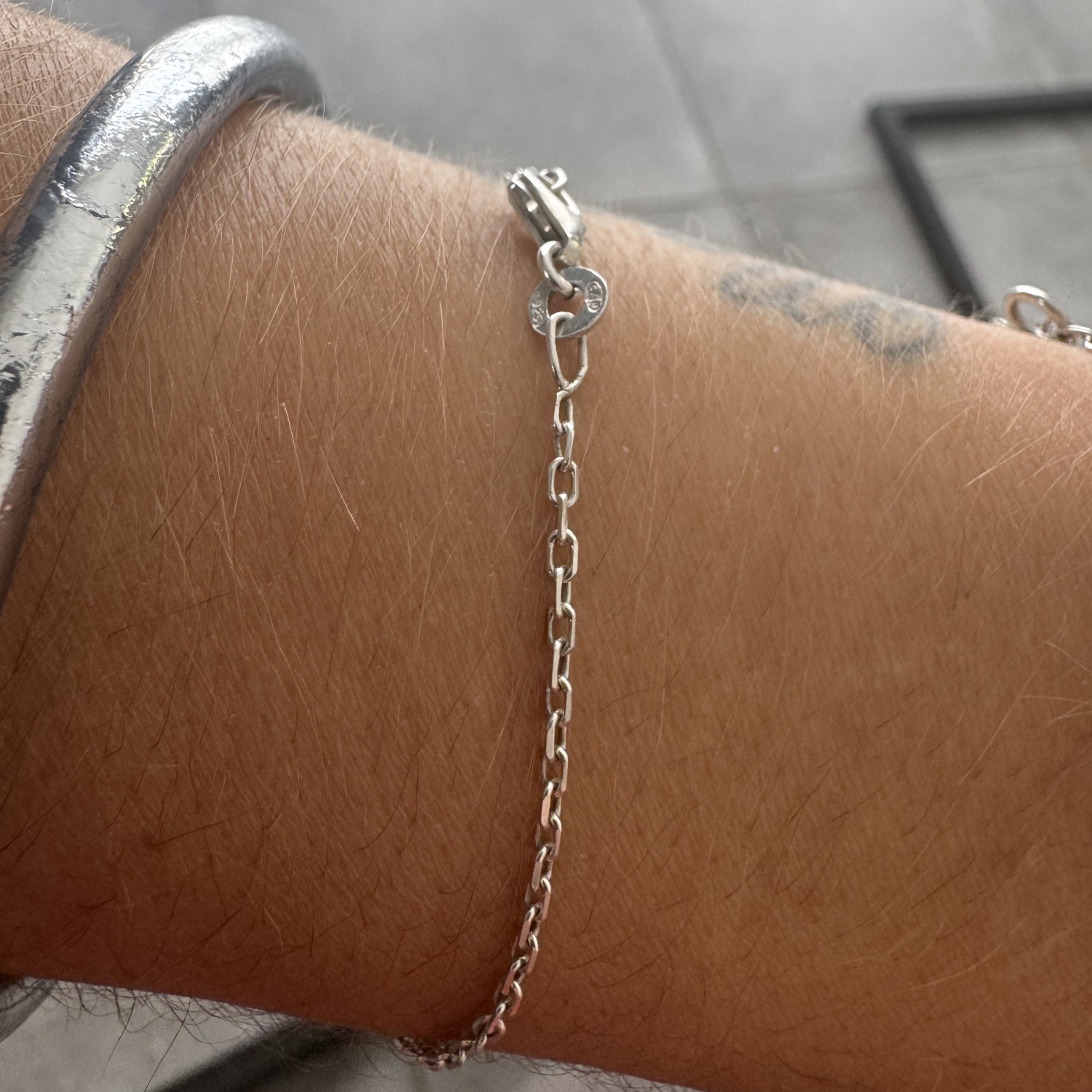 Description Bracelet en argent 925/000. Longueur 18 cm [Guide des tailles] Largeur 1.50 mm Maille Forcat diamantée Matière(s) Argent 925 . Les bijoux en argent que nous vous proposons sont faits d'argent 925/000. C'est-à-dire que chaque gramme de métal est composé de 92.5% d'argent pur et de 7.5 % d'autres métaux (essentiellement du cuivre). En effet, sous sa forme pure (soit 100%), l'argent est trop mou et ne peut être suffisamment rigide pour tenir sous forme de bijou. Nous le mêlons donc à d'autres métaux. Nous apposons un poinçon 925 sur tous nos bijoux afin de vous garantir que chaque création est bien en argent 925. Poids d'argent 1,16 gramme(s) Fermoir Mousqueton Couleur(s) dominante(s) Argenté Public Adulte . Genre Femme . Saison Indémodable . Rayon en magasin T52 Cliquez sur une matière, un thème, une couleur ou une collection pour voir tous les articles associés.