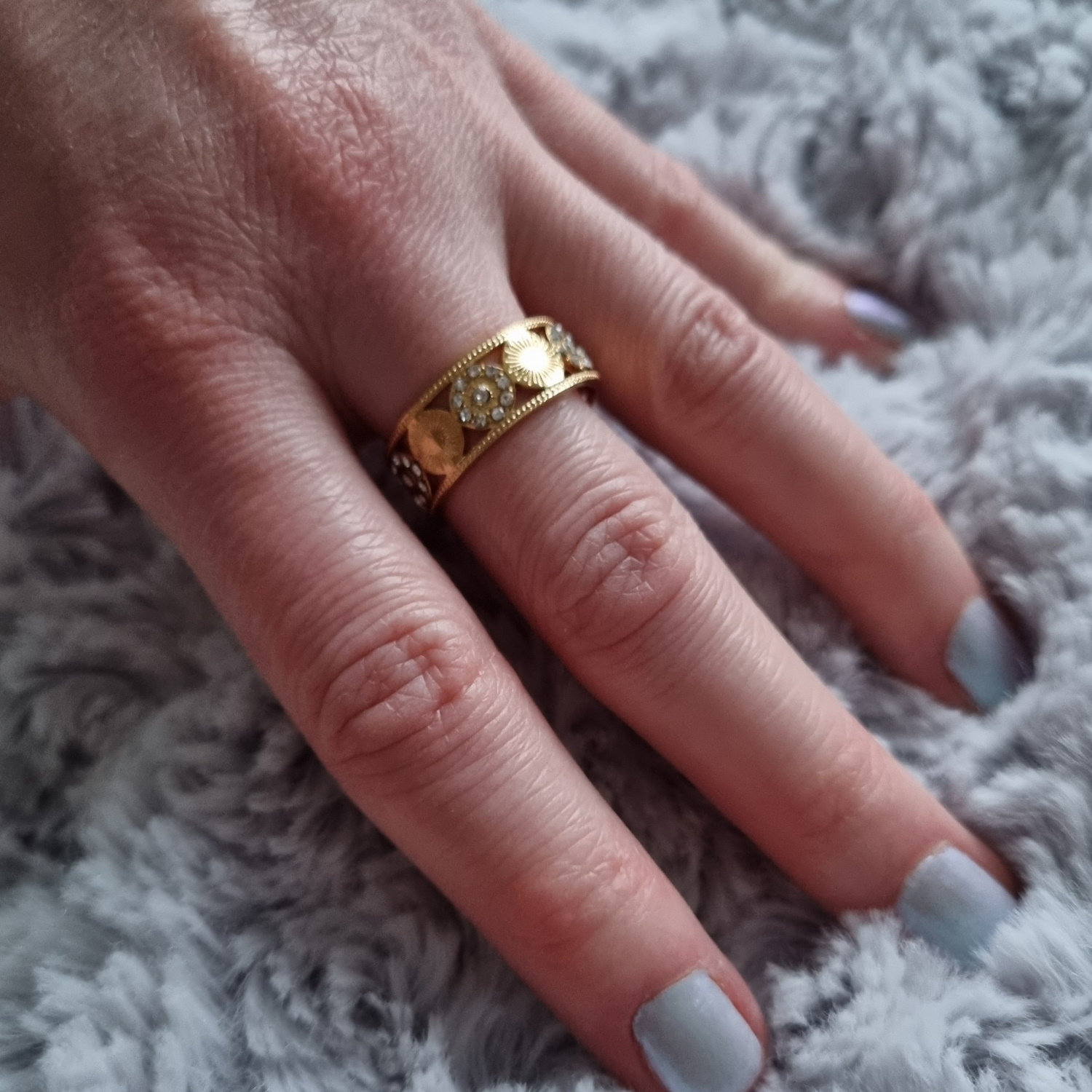 Description Bague composée de pastilles rondes avec motifs de rayons de soleil en acier 316L doré et certaines pavées de strass en verre. Taille ajustable. Largeur 7 mm Matière(s) Acier , Verre . L'acier utilisé dans la bijouterie existe sous plusieurs qualités. Nous utilisons principalement la qualité 316L, qualité qui est utilisée en chirurgie. Cet acier est donc inoxydable et reste très résistant. Fermoir Aucun Couleur(s) dominante(s) Doré Public Adolescent , Adulte . Genre Femme , Fille . Saison Indémodable . Cliquez sur une matière, un thème, une couleur ou une collection pour voir tous les articles associés.