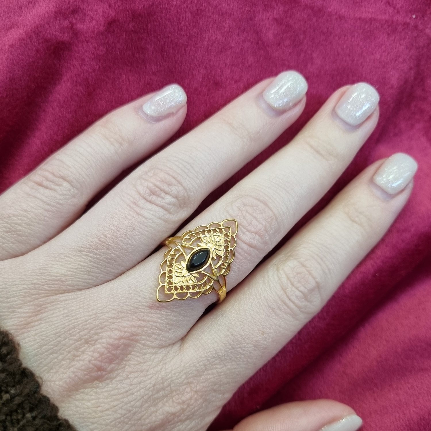 Description Bague au motifs dentelles en acier doré surmontée d'une pierre de couleur noire sertie clos de forme ovale. Taille ajustable. Largeur 25 mm Matière(s) Acier , Rocaille . L'acier utilisé dans la bijouterie existe sous plusieurs qualités. Nous utilisons principalement la qualité 316L, qualité qui est utilisée en chirurgie. Cet acier est donc inoxydable et reste très résistant. Couleur(s) dominante(s) Doré , Noir Public Adolescent , Adulte . Genre Femme , Fille . Saison Indémodable . Cliquez sur une matière, un thème, une couleur ou une collection pour voir tous les articles associés.