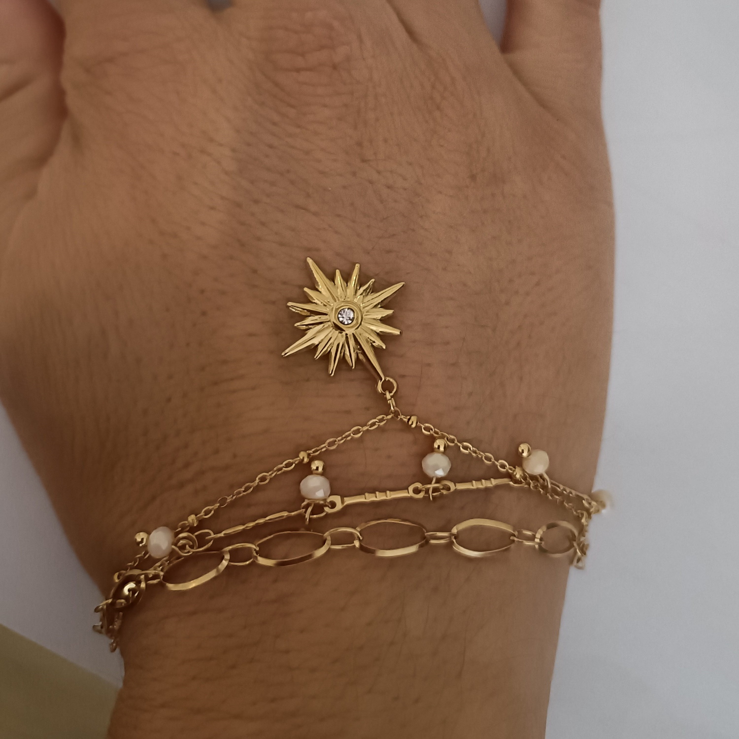 Description Bracelet triple rangs composé d'une chaîne en acier doré, une chaîne avec une étoile en acier doré surmontée d'un cristal, et une chaîne en acier doré avec pampilles en perles de couleur blanche. Fermoir mousqueton avec 3 cm de rallonge. Cliquez sur une matière, un thème, une couleur ou une collection pour voir tous les articles associés.
