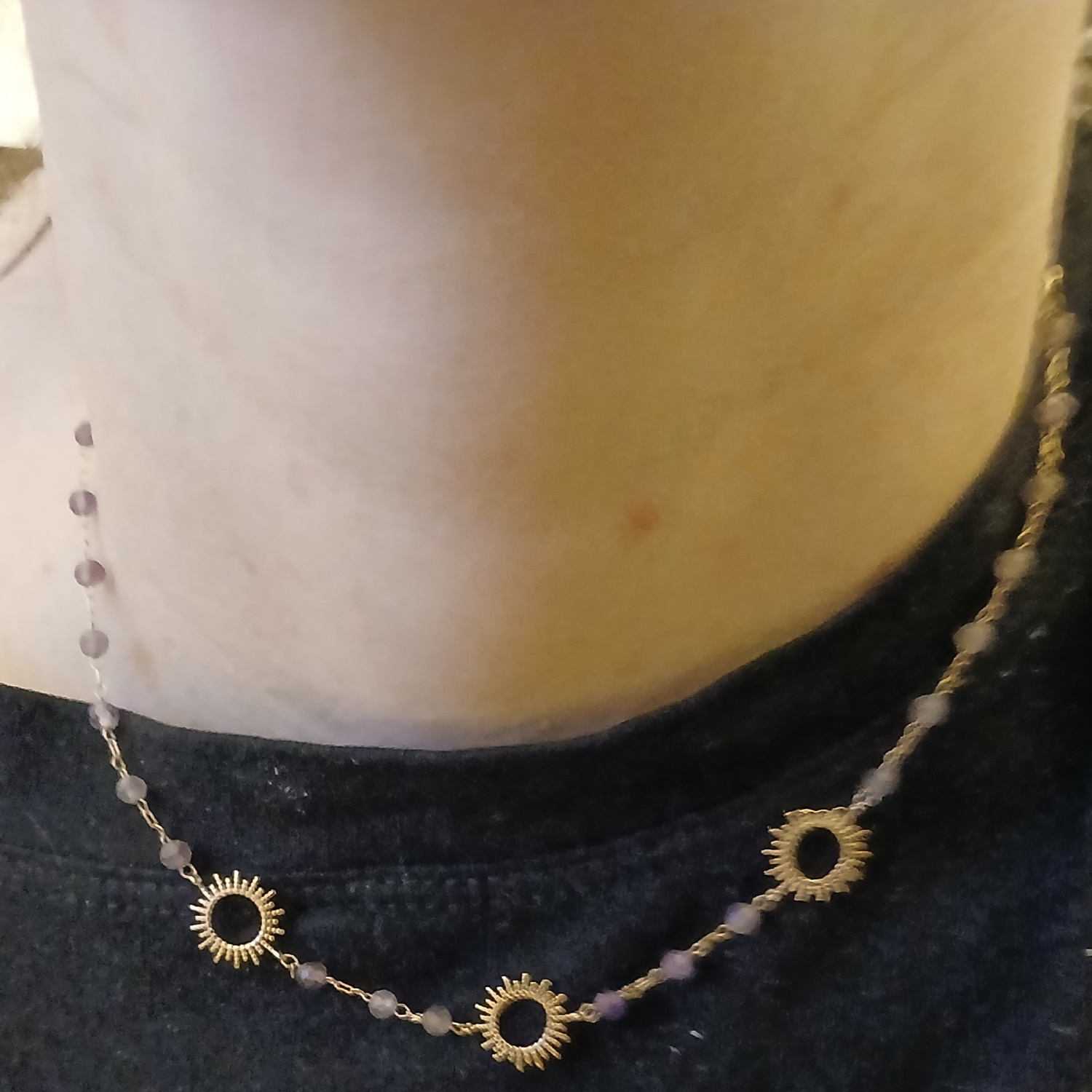 Collier composé d'une chaîne avec soleils en plaqué or jaune 18 carats et des perles en véritable pierre d'améthyste.