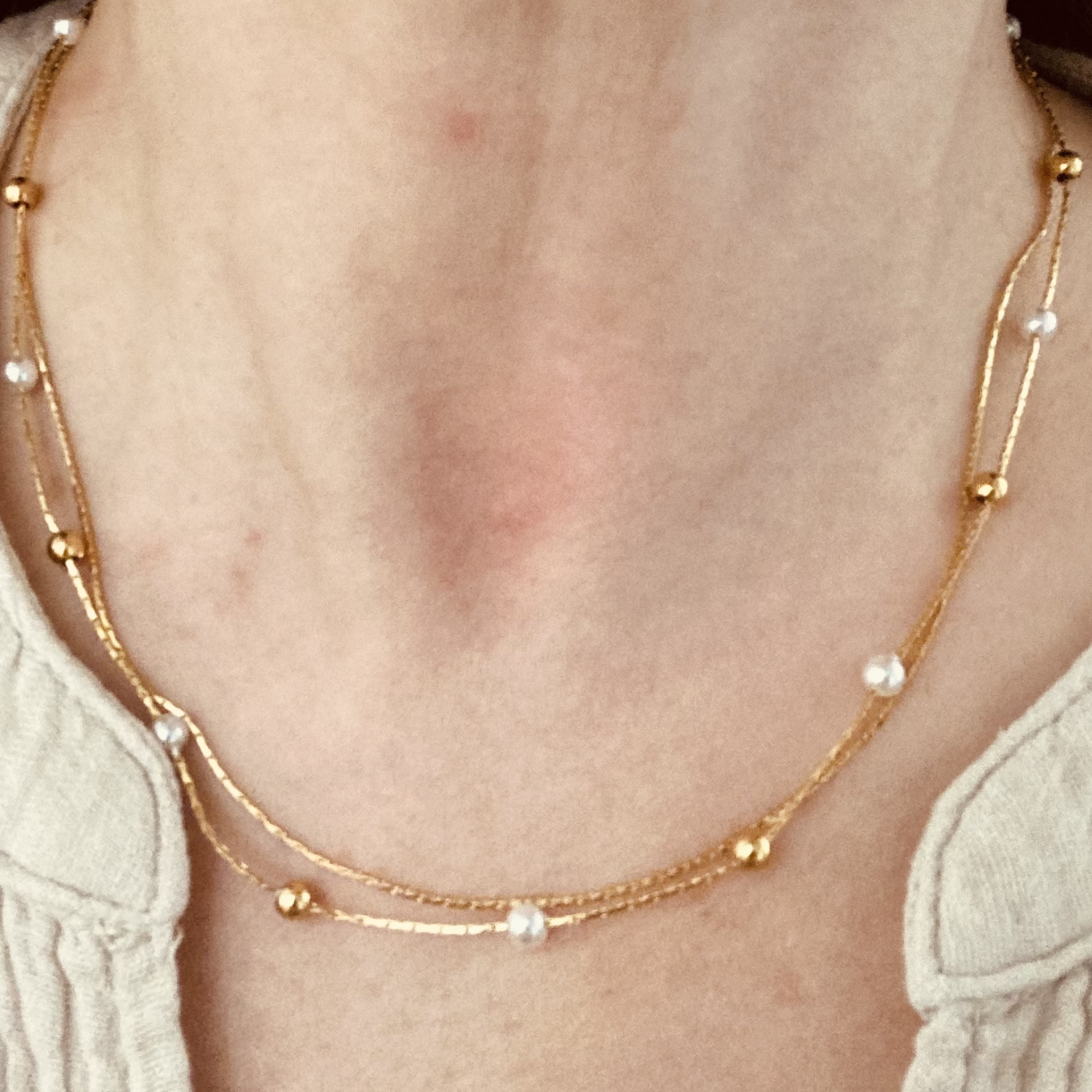 Description Collier double rangs composé d'une chaîne avec perles en acier doré et perles d'imitation et d'une chaîne en acier doré. Fermoir mousqueton avec 4 cm de rallonge. Cliquez sur une matière, un thème, une couleur ou une collection pour voir tous les articles associés.
