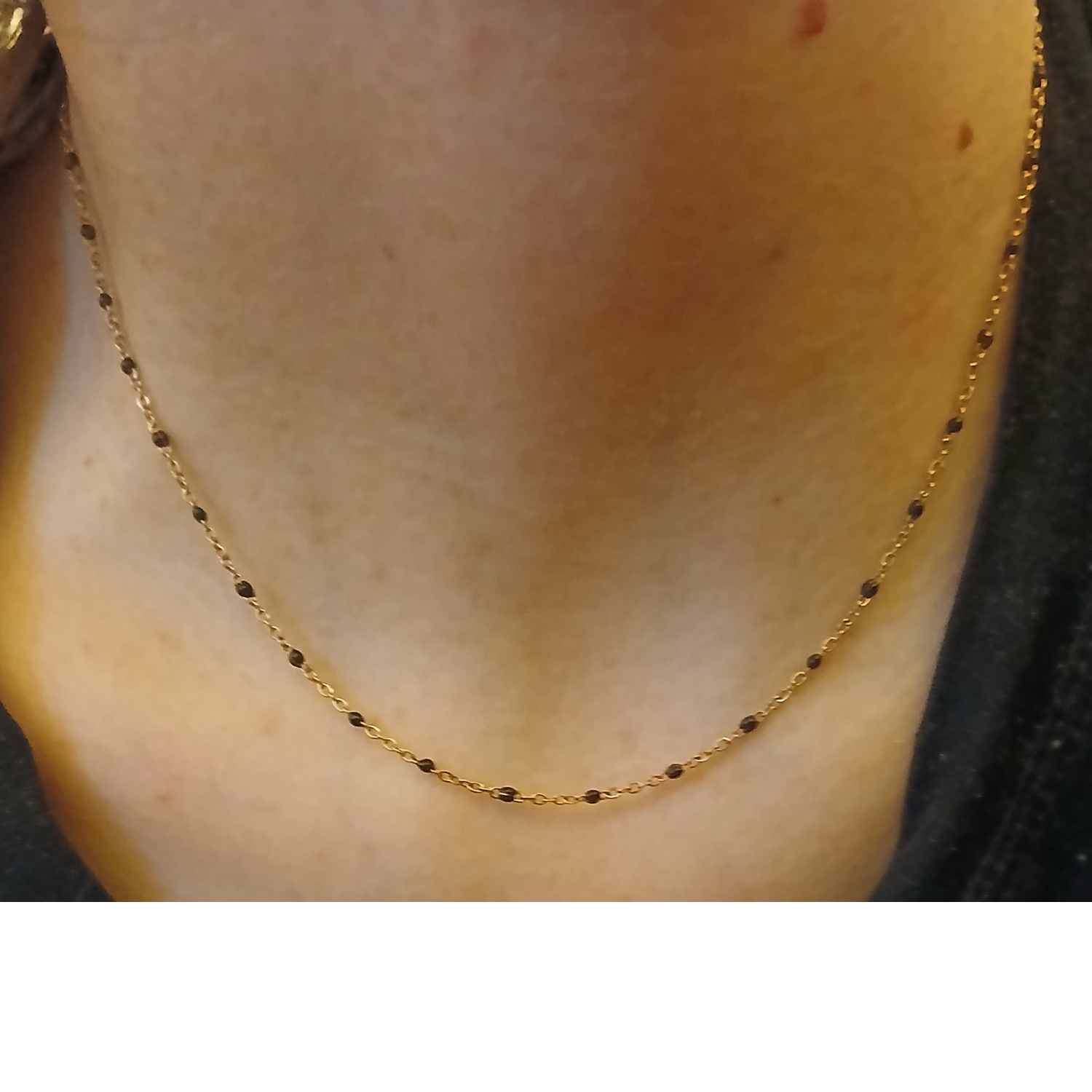 Description Collier composé d'une chaîne en acier doré et de perles en émail de couleur noire. Fermoir mousqueton avec 5 cm de rallonge. Cliquez sur une matière, un thème, une couleur ou une collection pour voir tous les articles associés.