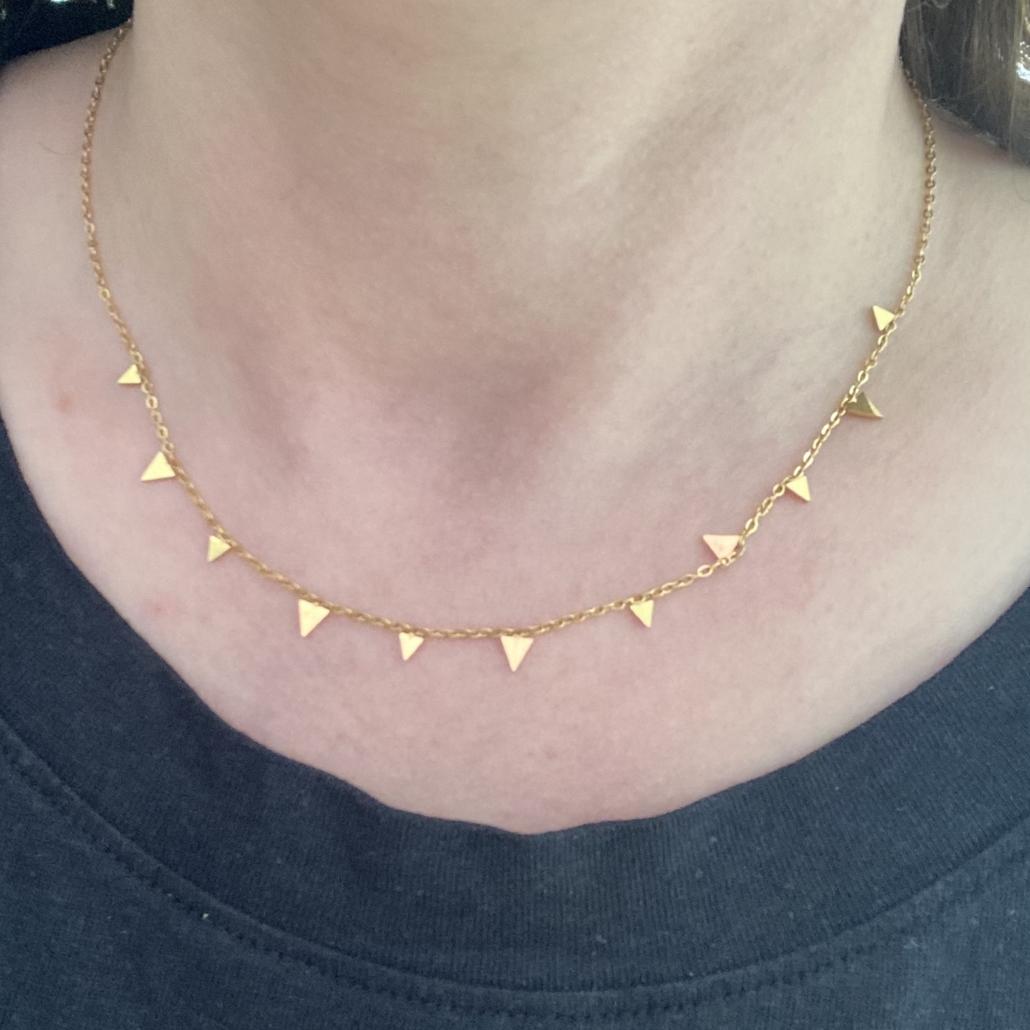 Description Collier composé d'une chaîne et de pampilles en forme de triangle en acier doré. Fermoir mousqueton avec 5 cm de rallonge. Longueur 40+5 cm [Guide des tailles] Largeur 5 mm Matière(s) Acier . L'acier utilisé dans la bijouterie existe sous plusieurs qualités. Nous utilisons principalement la qualité 316L, qualité qui est utilisée en chirurgie. Cet acier est donc inoxydable et reste très résistant. Fermoir Mousqueton Couleur(s) dominante(s) Doré Public Adolescent , Adulte . Genre Femme , Fille . Saison Indémodable . Cliquez sur une matière, un thème, une couleur ou une collection pour voir tous les articles associés.