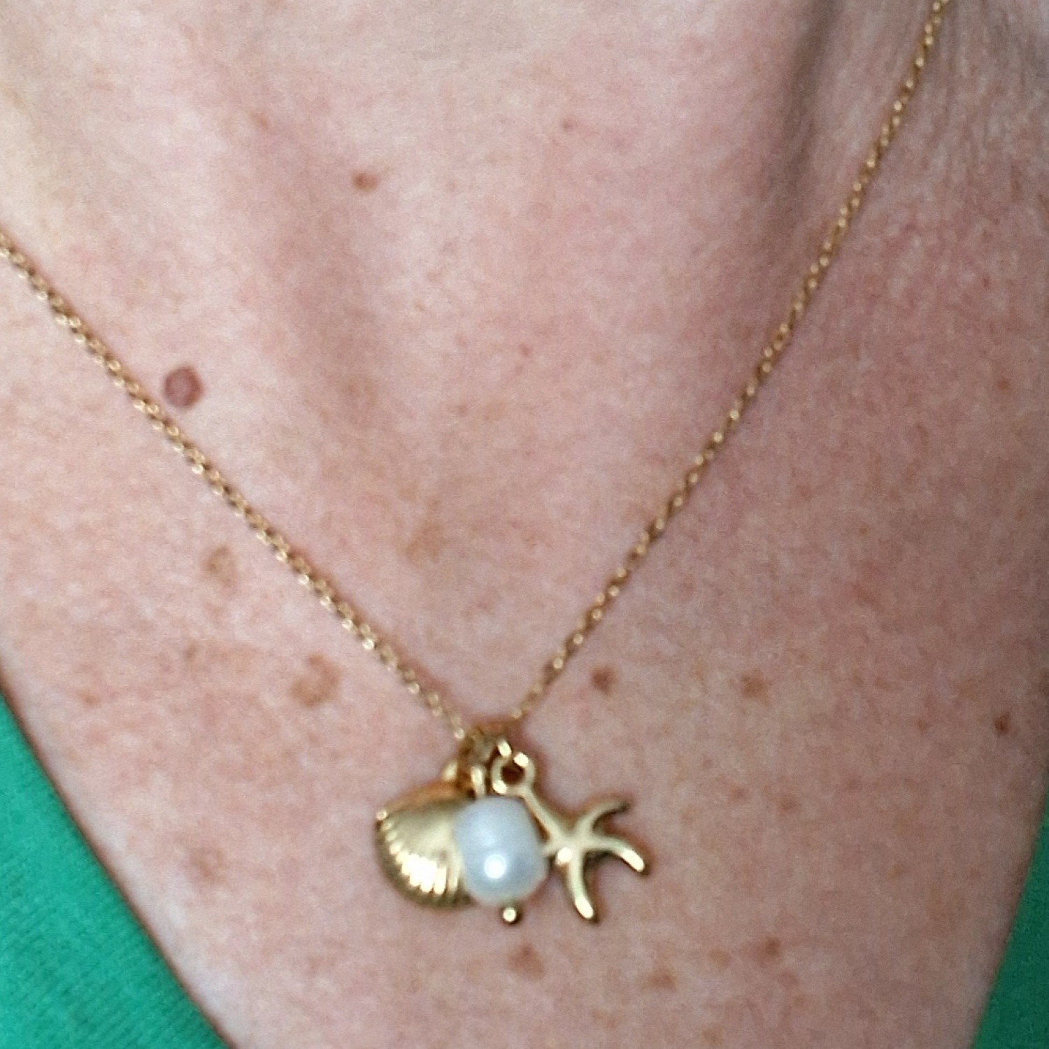 Description Collier composé d'une chaîne avec pendentifs en forme d'étoile de mer et de coquillage en acier doré et d'un pendentif en nacre d'imitation. Fermoir mousqueton avec 5 cm de rallonge. Cliquez sur une matière, un thème, une couleur ou une collection pour voir tous les articles associés.