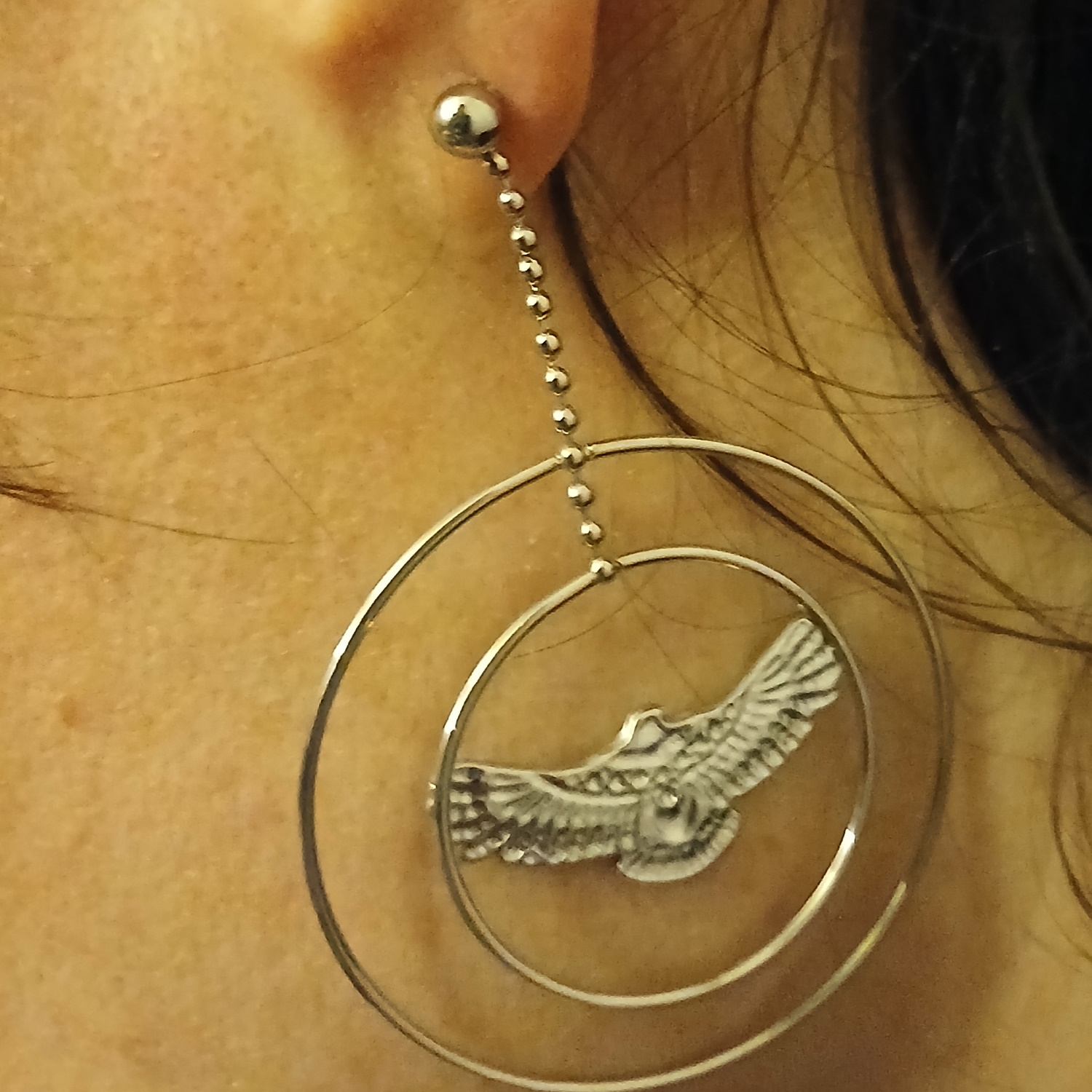 Description Boucles d'oreilles pendantes composées de deux cercles avec un aigle en acier argenté. Largeur 39 mm Hauteur 60 mm Matière(s) Acier . L'acier utilisé dans la bijouterie existe sous plusieurs qualités. Nous utilisons principalement la qualité 316L, qualité qui est utilisée en chirurgie. Cet acier est donc inoxydable et reste très résistant. Fermoir Tiges poussettes Couleur(s) dominante(s) Argenté Public Adolescent , Adulte . Genre Femme , Fille . Saison Indémodable . Thème(s) Animaux . Cliquez sur une matière, un thème, une couleur ou une collection pour voir tous les articles associés.