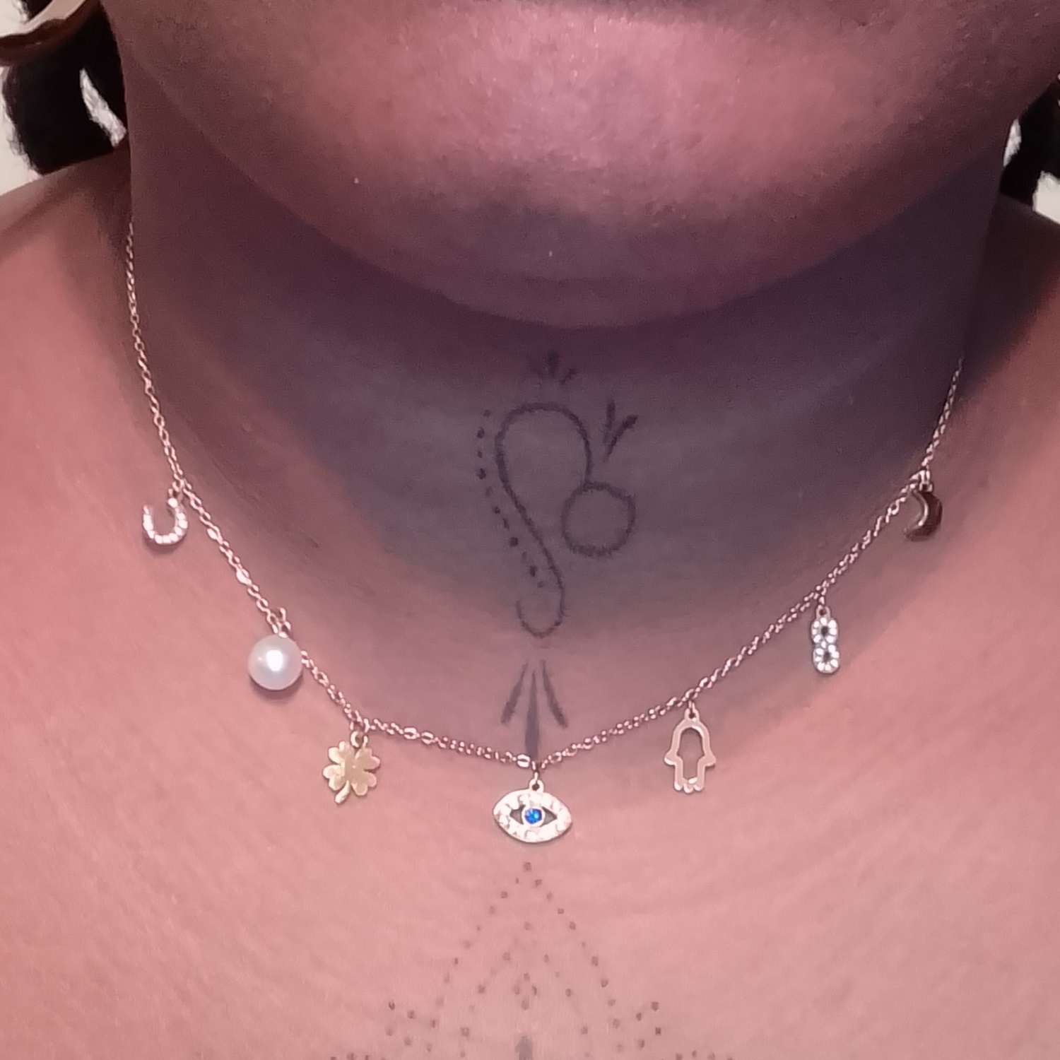Collier composé d'une chaîne avec pendants croissant de lune, d'une main de fatma et d'un trèfle à quatre feuilles en acier doré, de pendants symboles infini et fer à cheval pavés de strass, d'un œil de Turquie pavé de strass et serti d'un cristal bleu et d'une perle d'imitation.