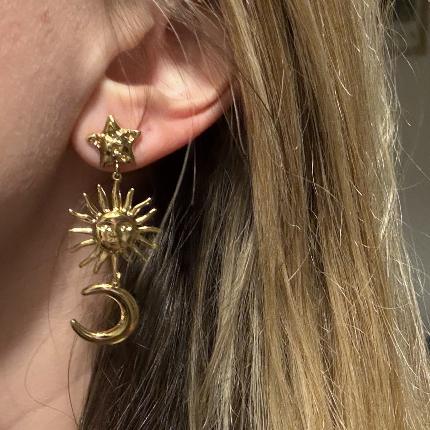 Description Boucles d'oreilles pendantes composées d'une étoile, d'un soleil avec visage et d'un croissant de lune en acier doré. Largeur 20 mm Hauteur 56 mm Matière(s) Acier . L'acier utilisé dans la bijouterie existe sous plusieurs qualités. Nous utilisons principalement la qualité 316L, qualité qui est utilisée en chirurgie. Cet acier est donc inoxydable et reste très résistant. Fermoir Tiges poussettes Couleur(s) dominante(s) Doré Public Adolescent , Adulte . Genre Femme , Fille . Saison Indémodable . Thème(s) Nature , Personnage . Cliquez sur une matière, un thème, une couleur ou une collection pour voir tous les articles associés.
