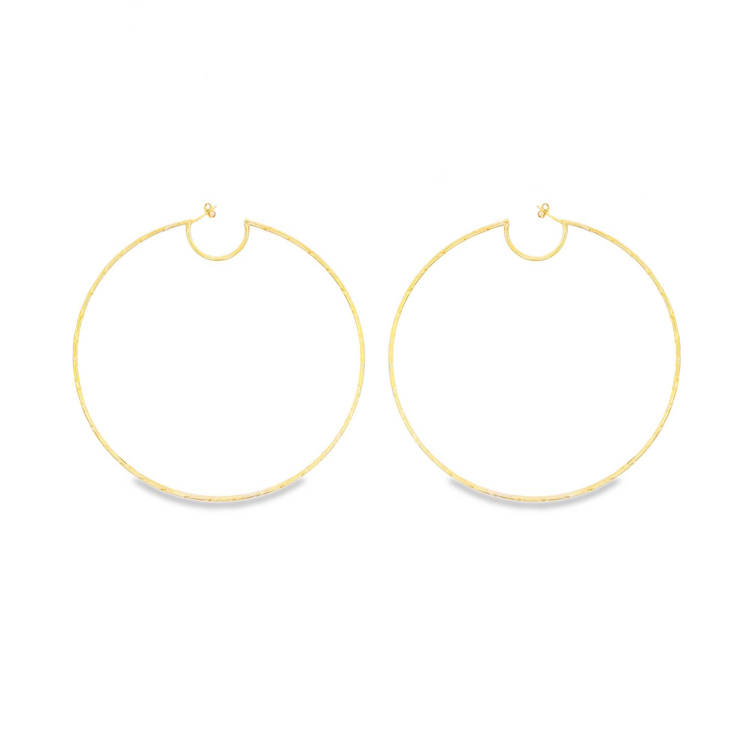 Ces boucles d'oreilles en plaqué or jaune 18 carats se distinguent par leur format XXL et leur silhouette originale. Contrairement aux créoles parfaitement circulaires, elles présentent une encoche en demi-lune au niveau de l'attache, créant un décroché géométrique sophistiqué qui habille délicatement le lobe de l'oreille.