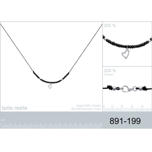 Collier en argent 925/000 rhodié, oxyde de zirconium et coton.