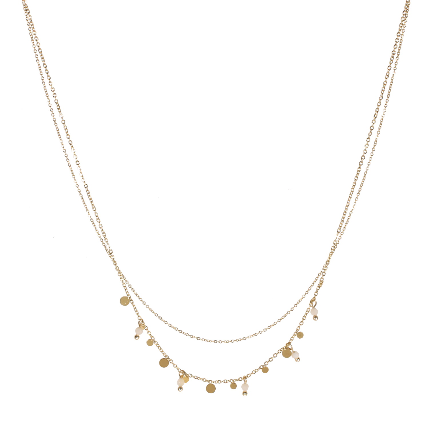 Collier double rangs composé d'une chaîne de 39 cm de long en acier doré, ainsi qu'une chaîne de 40 cm de long avec pampilles rondes en acier doré et pampilles en véritable pierre de lune.