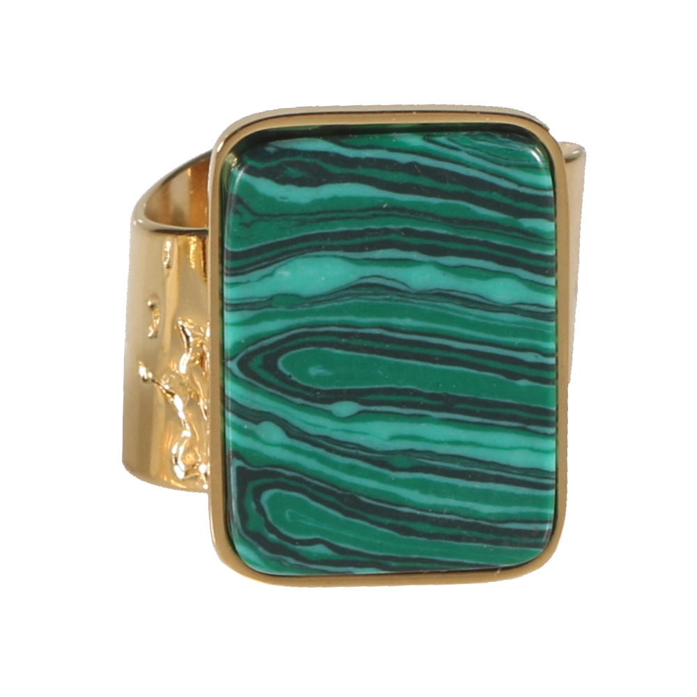 Description Bague à l'anneau large et difforme avec motif en acier doré surmontée d'une pierre d'imitation de malachite sertie clos de forme rectangulaire. Taille ajustable. Largeur 19 mm Matière(s) Acier , Rocaille . L'acier utilisé dans la bijouterie existe sous plusieurs qualités. Nous utilisons principalement la qualité 316L, qualité qui est utilisée en chirurgie. Cet acier est donc inoxydable et reste très résistant. Fermoir Aucun Couleur(s) dominante(s) Doré , Vert Public Adolescent , Adulte . Genre Femme , Fille . Saison Indémodable . Cliquez sur une matière, un thème, une couleur ou une collection pour voir tous les articles associés.