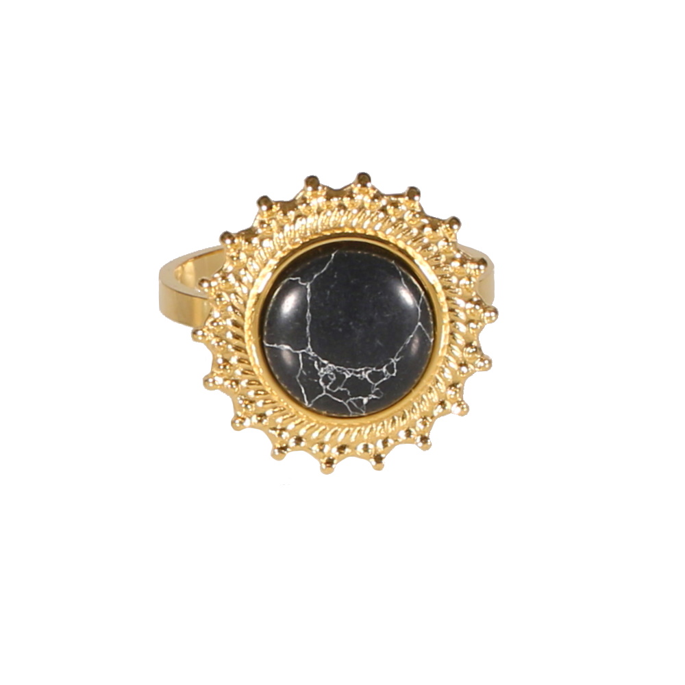 Description Bague en forme de soleil en acier doré surmontée d'une pierre de couleur noire. Taille ajustable. Largeur 17 mm Matière(s) Acier , Rocaille . L'acier utilisé dans la bijouterie existe sous plusieurs qualités. Nous utilisons principalement la qualité 316L, qualité qui est utilisée en chirurgie. Cet acier est donc inoxydable et reste très résistant. Fermoir Aucun Couleur(s) dominante(s) Doré , Noir Public Adolescent , Adulte . Genre Femme , Fille . Saison Indémodable . Cliquez sur une matière, un thème, une couleur ou une collection pour voir tous les articles associés.
