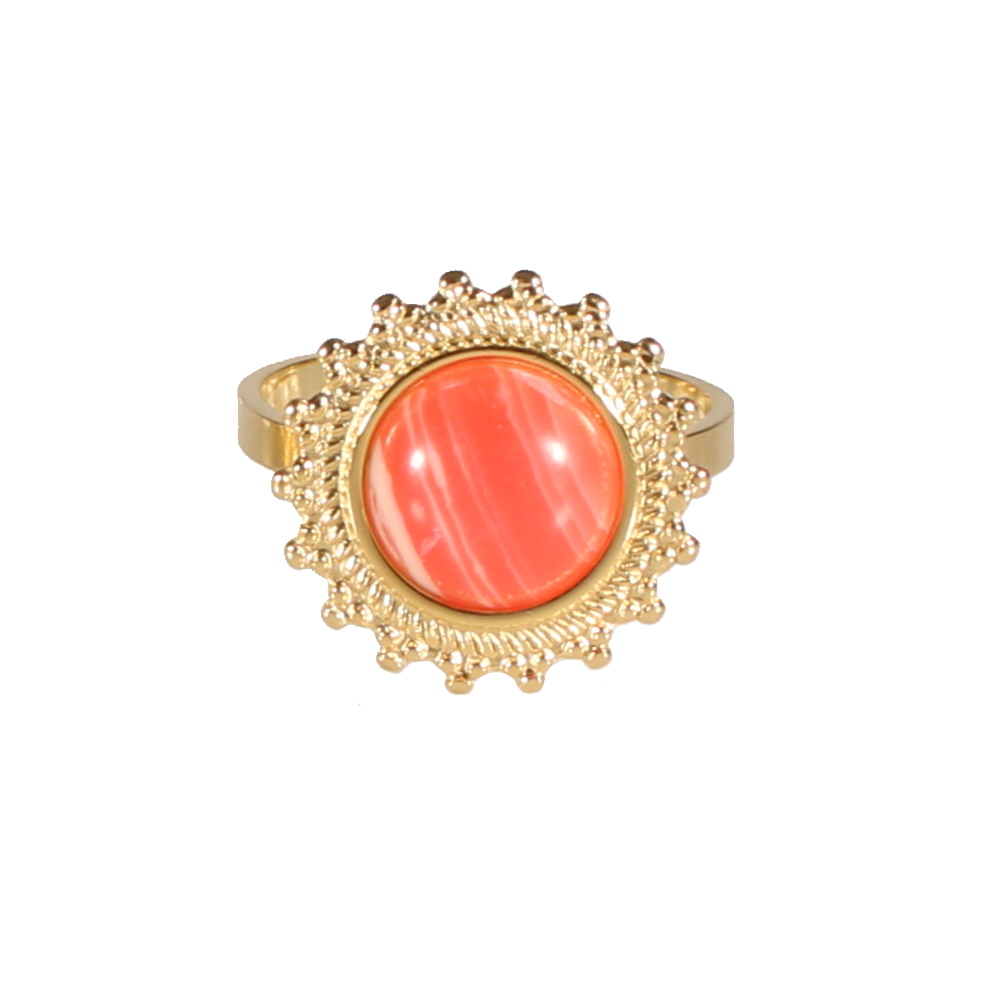 Description Bague en forme de soleil en acier doré surmontée d'une pierre de couleur rouge. Taille ajustable. Largeur 17 mm Matière(s) Acier , Rocaille . L'acier utilisé dans la bijouterie existe sous plusieurs qualités. Nous utilisons principalement la qualité 316L, qualité qui est utilisée en chirurgie. Cet acier est donc inoxydable et reste très résistant. Fermoir Aucun Couleur(s) dominante(s) Doré , Rouge Public Adolescent , Adulte . Genre Femme , Fille . Saison Indémodable . Cliquez sur une matière, un thème, une couleur ou une collection pour voir tous les articles associés.