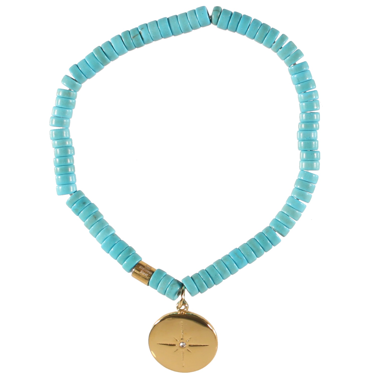 Bracelet élastique composé de perles cylindriques en pierre d'imitation turquoise et un pendant rond avec le motif d'une étoile surmontée d'un cristal en verre.