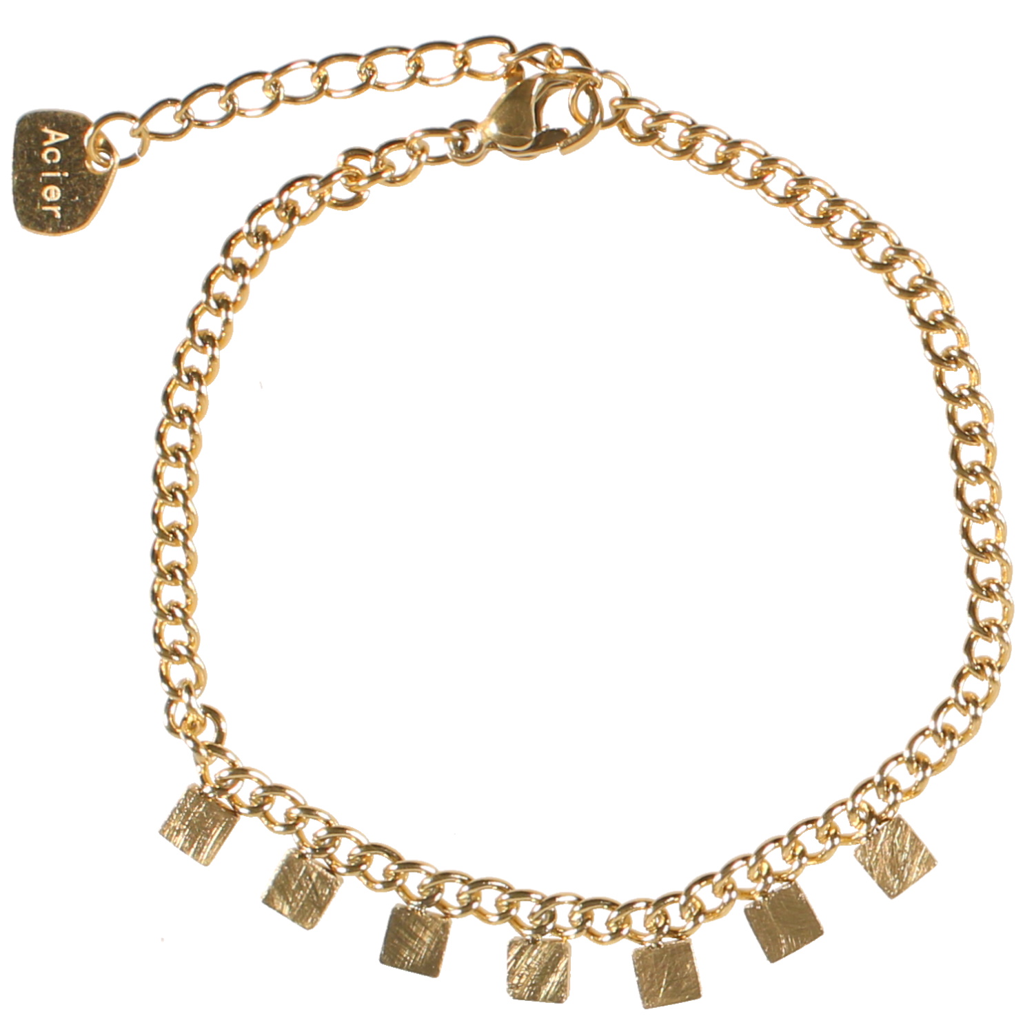 Description Bracelet composé d'une chaîne avec pampilles de forme carré en acier doré. Fermoir mousqueton avec rallonge de 3 cm. Cliquez sur une matière, un thème, une couleur ou une collection pour voir tous les articles associés.