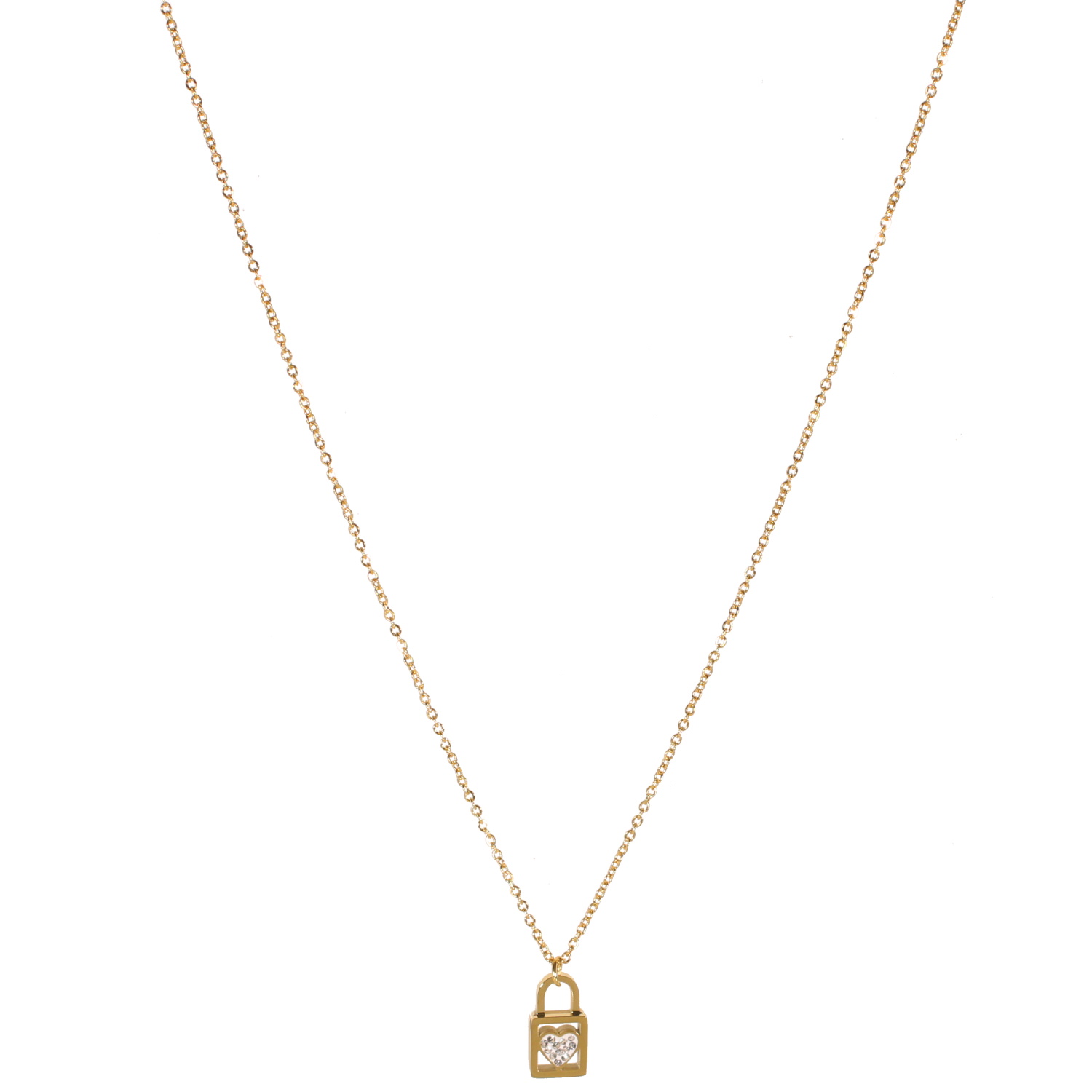 Description Collier composé d'une chaîne et d'un pendentif cadenas en acier doré avec au centre un cœur pavé de strass. Fermoir mousqueton avec 5 cm de rallonge. Cliquez sur une matière, un thème, une couleur ou une collection pour voir tous les articles associés.