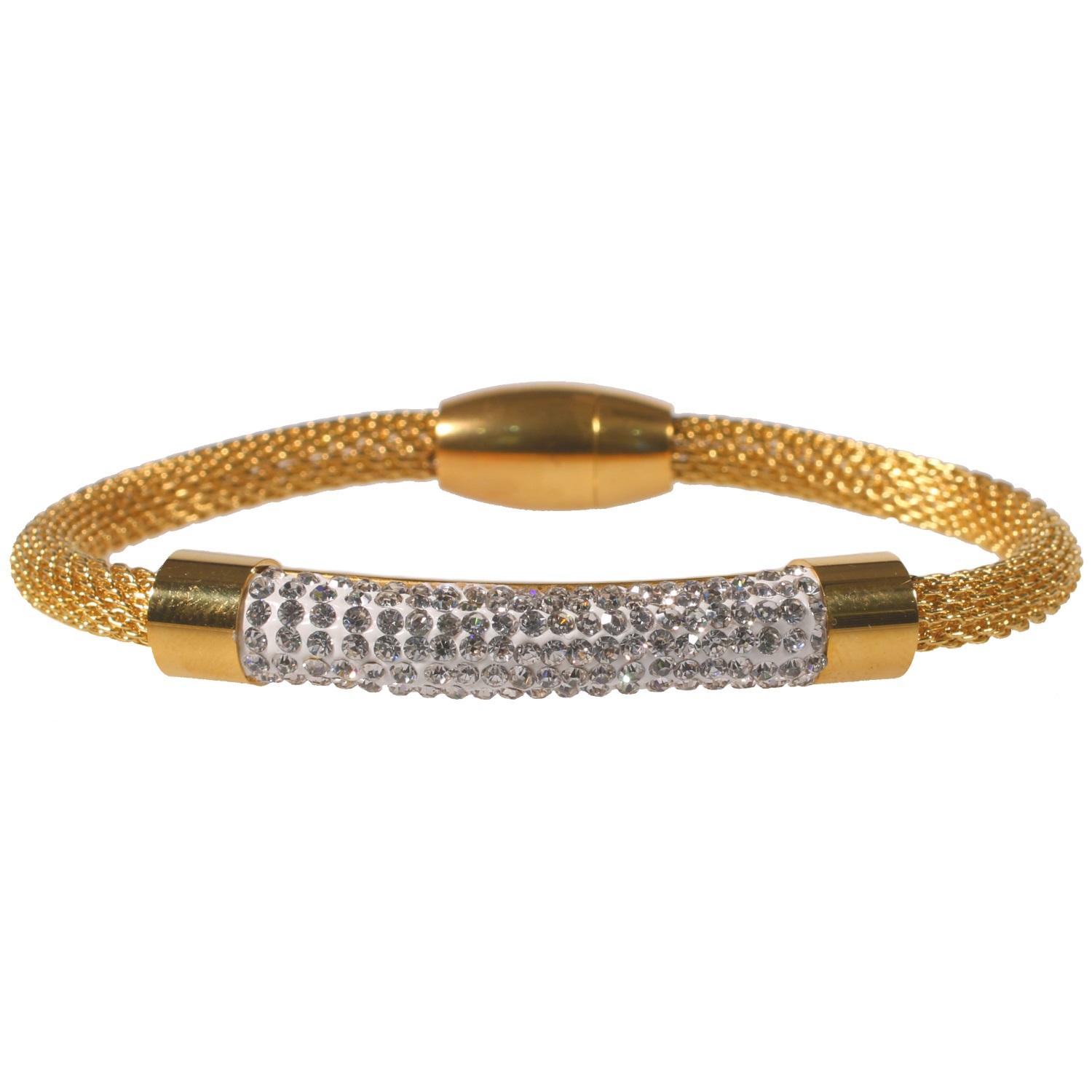 Description Bracelet jonc semi rigide en acier doré et verre. Longueur 18 cm [Guide des tailles] Largeur 0.8 cm Matière(s) Acier , Verre . L'acier utilisé dans la bijouterie existe sous plusieurs qualités. Nous utilisons principalement la qualité 316L, qualité qui est utilisée en chirurgie. Cet acier est donc inoxydable et reste très résistant. Fermoir Aimants Couleur(s) dominante(s) Doré Public Adulte . Genre Femme . Saison Indémodable . Cliquez sur une matière, un thème, une couleur ou une collection pour voir tous les articles associés.