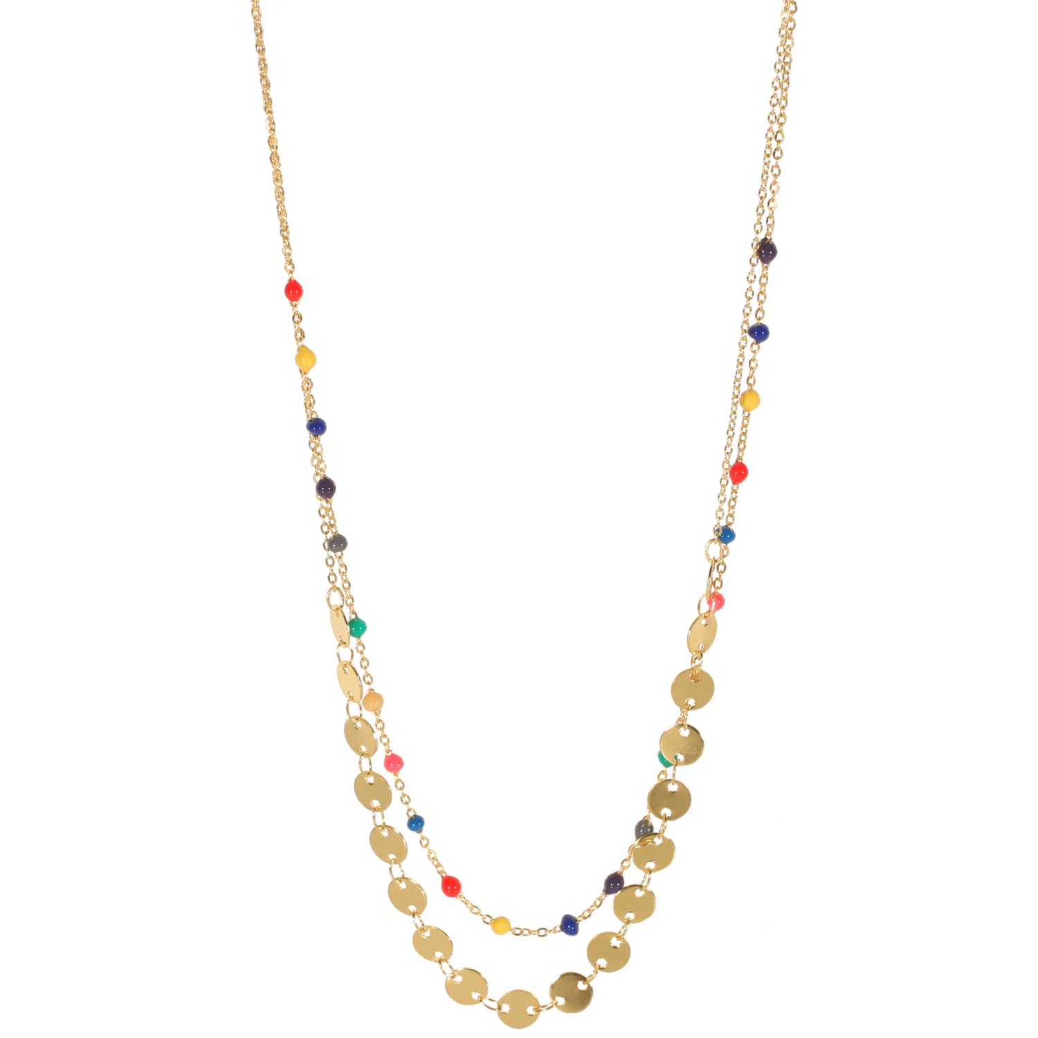 Description Collier multi rangs en acier doré et perles de couleur. 2 rangs. Cliquez sur une matière, un thème, une couleur ou une collection pour voir tous les articles associés.