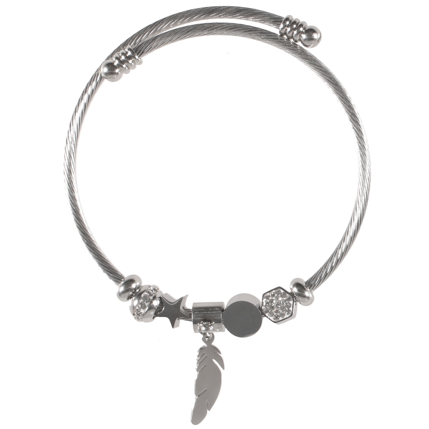 Description Bracelet charms avec perles, étoile et breloque plume en acier argenté et strass en verre. Cliquez sur une matière, un thème, une couleur ou une collection pour voir tous les articles associés.