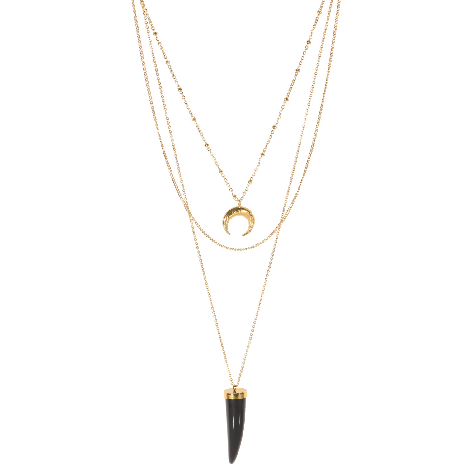 Description Collier triple rangs composé d'un collier de 38 cm de long avec pendentif croissant en acier doré, un collier de 44 cm de long en acier doré ainsi qu'un collier de 54 cm de long et pendentif imitation défense en acier doré et matière synthétique. L'ensemble peut se régler jusqu'à 7 cm. Longueur 38+7 cm [Guide des tailles] Matière(s) Acier , Plastique . L'acier utilisé dans la bijouterie existe sous plusieurs qualités. Nous utilisons principalement la qualité 316L, qualité qui est utilisée en chirurgie. Cet acier est donc inoxydable et reste très résistant. Fermoir Mousqueton À noter Pendentif croissant 15x13 mm et pendentif 10x40 mm Couleur(s) dominante(s) Doré , Noir Public Adolescent , Adulte . Genre Femme , Fille . Saison Indémodable . Collection Myriade Cliquez sur une matière, un thème, une couleur ou une collection pour voir tous les articles associés.