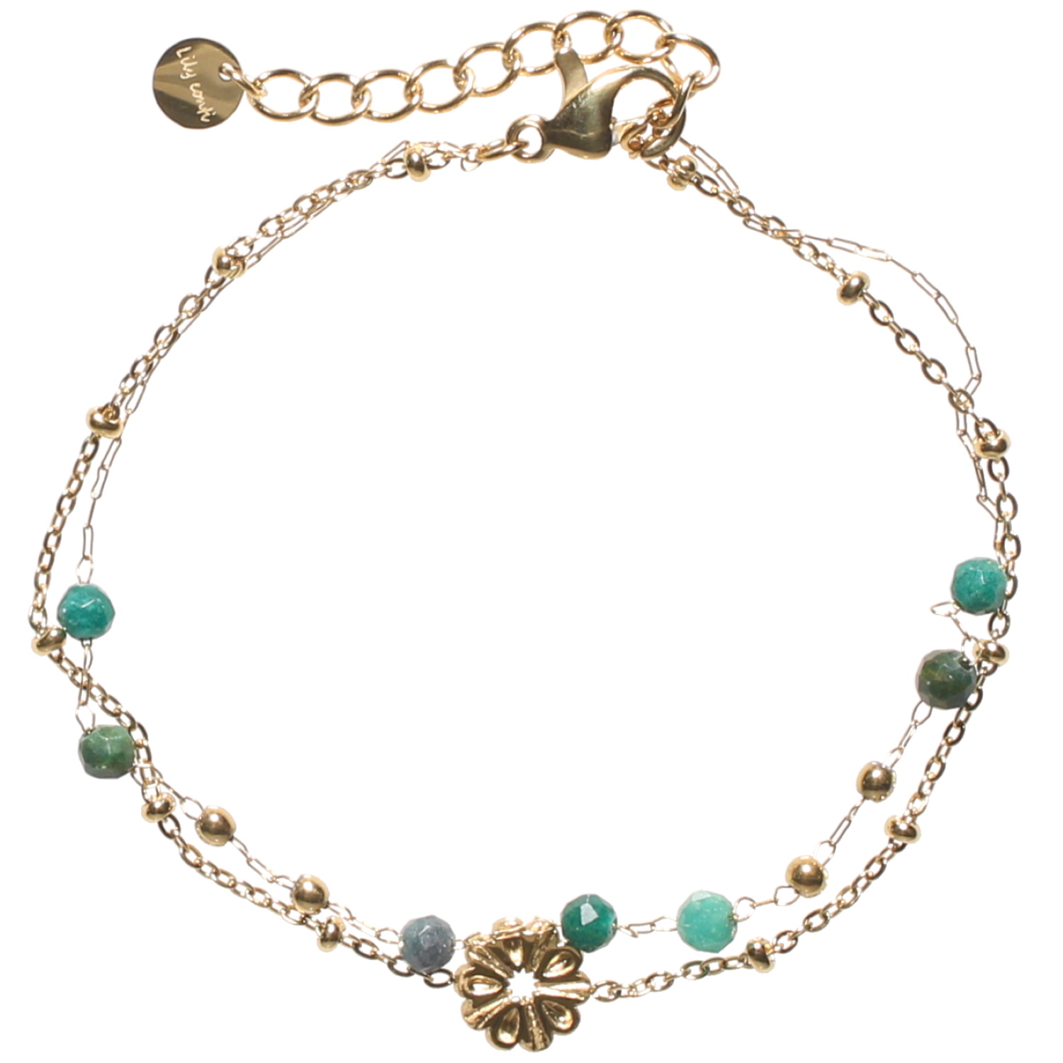 Description Bracelet triple rangs composé d'une chaîne avec une fleur en acier doré, ainsi qu'une chaîne avec perles en acier doré et de perles de couleur verte. Fermoir mousqueton avec 3 cm de rallonge. Cliquez sur une matière, un thème, une couleur ou une collection pour voir tous les articles associés.
