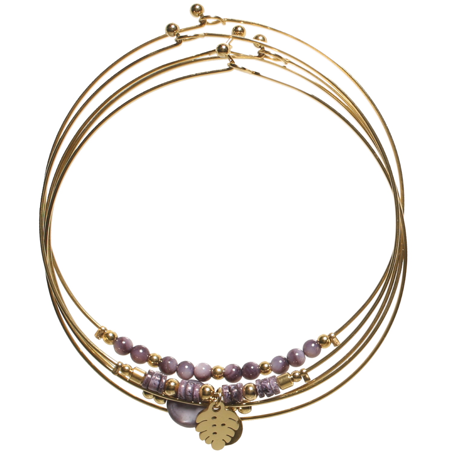 Lot de 5 bracelets joncs en acier doré surmontés de perles de couleur noire et grise et d'une pierre ronde de couleur noire nacrée avec une feuille philodendron en acier doré.