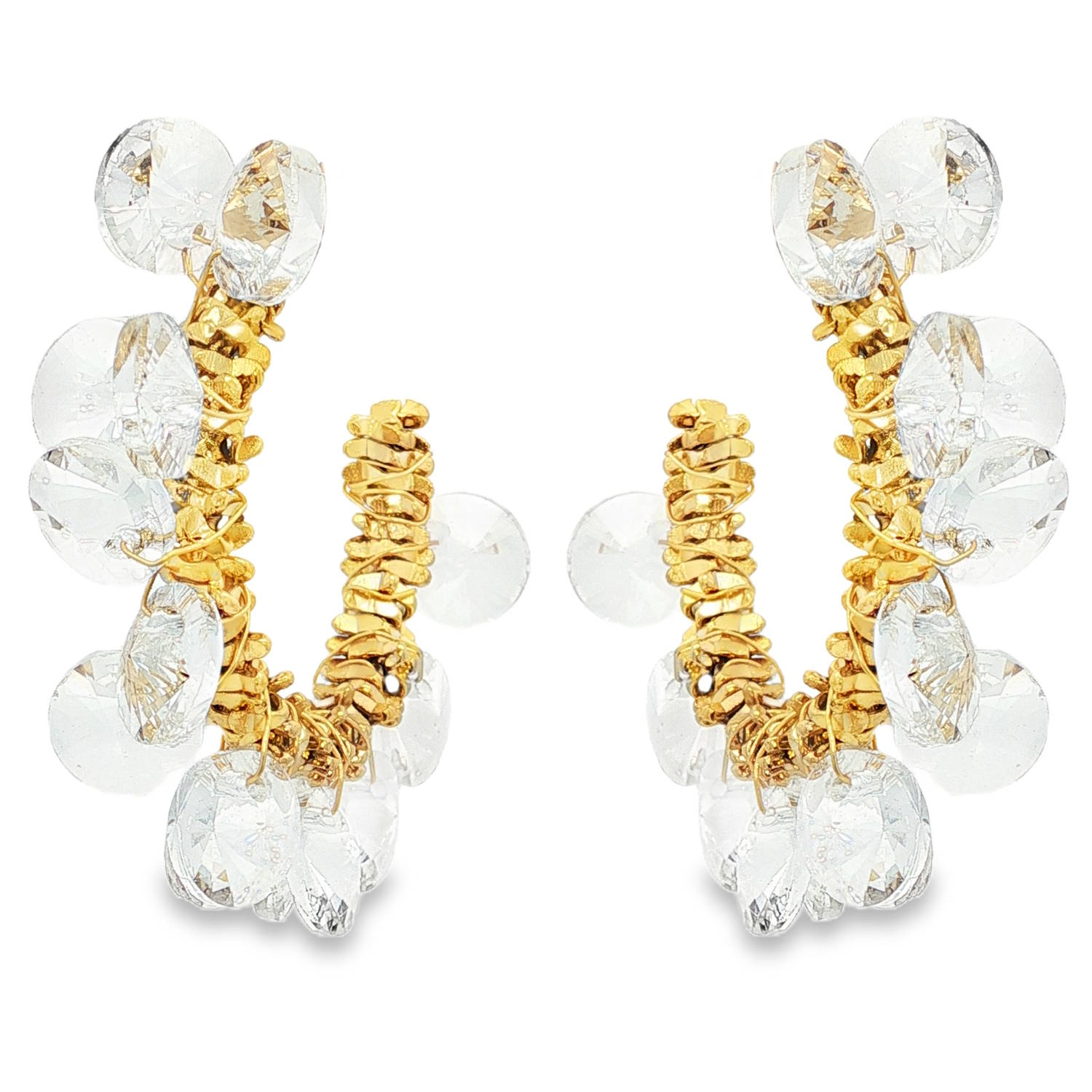 Fabriquées en acier doré, ces boucles d'oreilles sont ornées de cristaux ronds taillés en brillant, qui réfléchissent la lumière avec une clarté et une symétrie exceptionnelles.