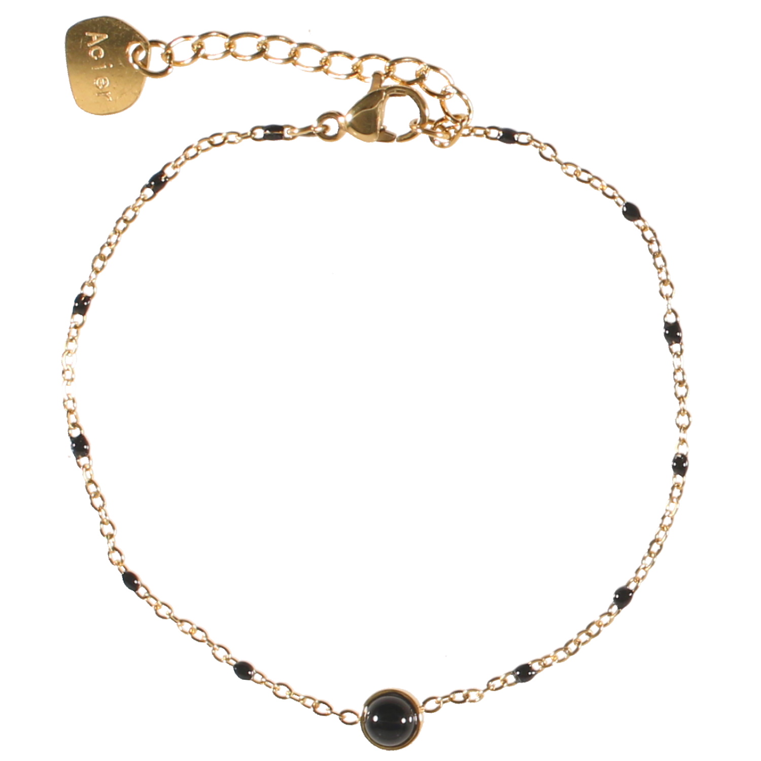 Description Bracelet composé d'une chaîne en acier doré, de perles en émail de couleur noire et d'une véritable pierre d'agate noire sertie clos de forme ronde. Fermoir mousqueton avec 3 cm de rallonge. Cliquez sur une matière, un thème, une couleur ou une collection pour voir tous les articles associés.
