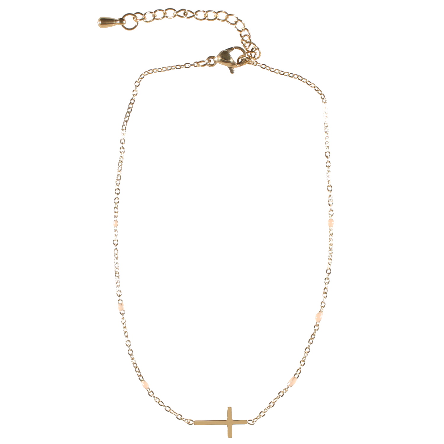 Bracelet chaîne de cheville composé d'une chaîne et d'une croix en acier doré et de perles en émail de couleur rose.