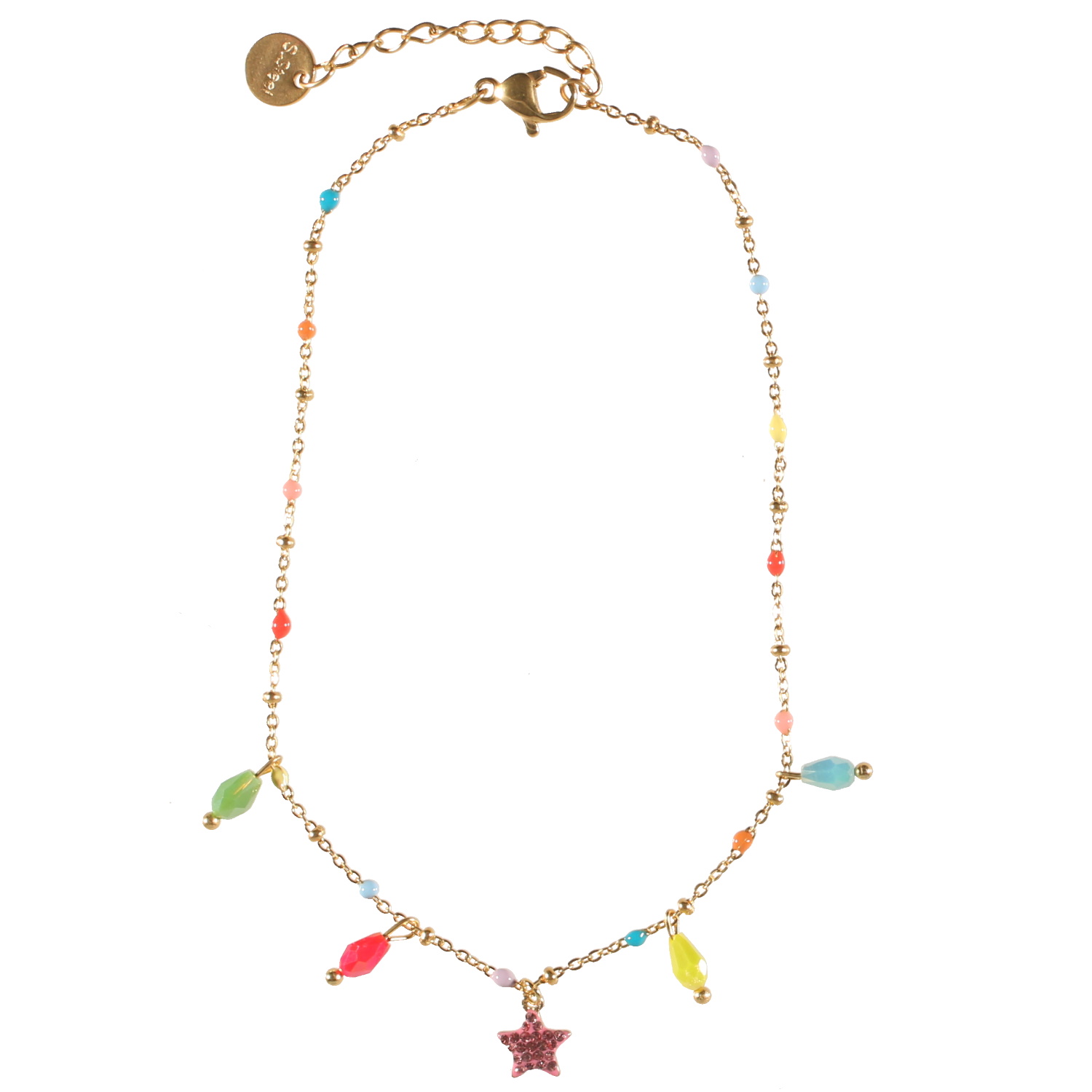 Bracelet chaîne de cheville composé d'une chaîne en acier doré, de perles en émail multicolore, pampilles de perles multicolores et d'une étoile pavée de strass de couleur rose.