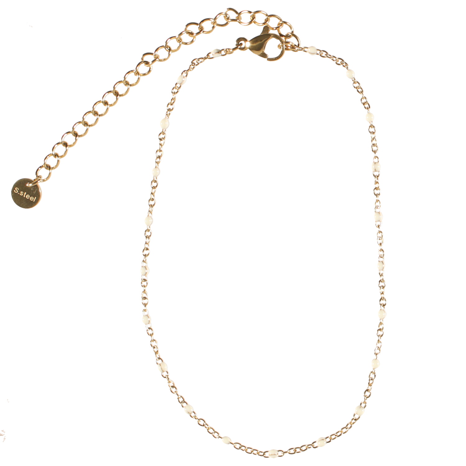 Description Bracelet chaîne de cheville composé d'une chaîne en acier doré et de perles en émail de couleur blanc. Fermoir mousqueton avec 5 cm de rallonge. Cliquez sur une matière, un thème, une couleur ou une collection pour voir tous les articles associés.