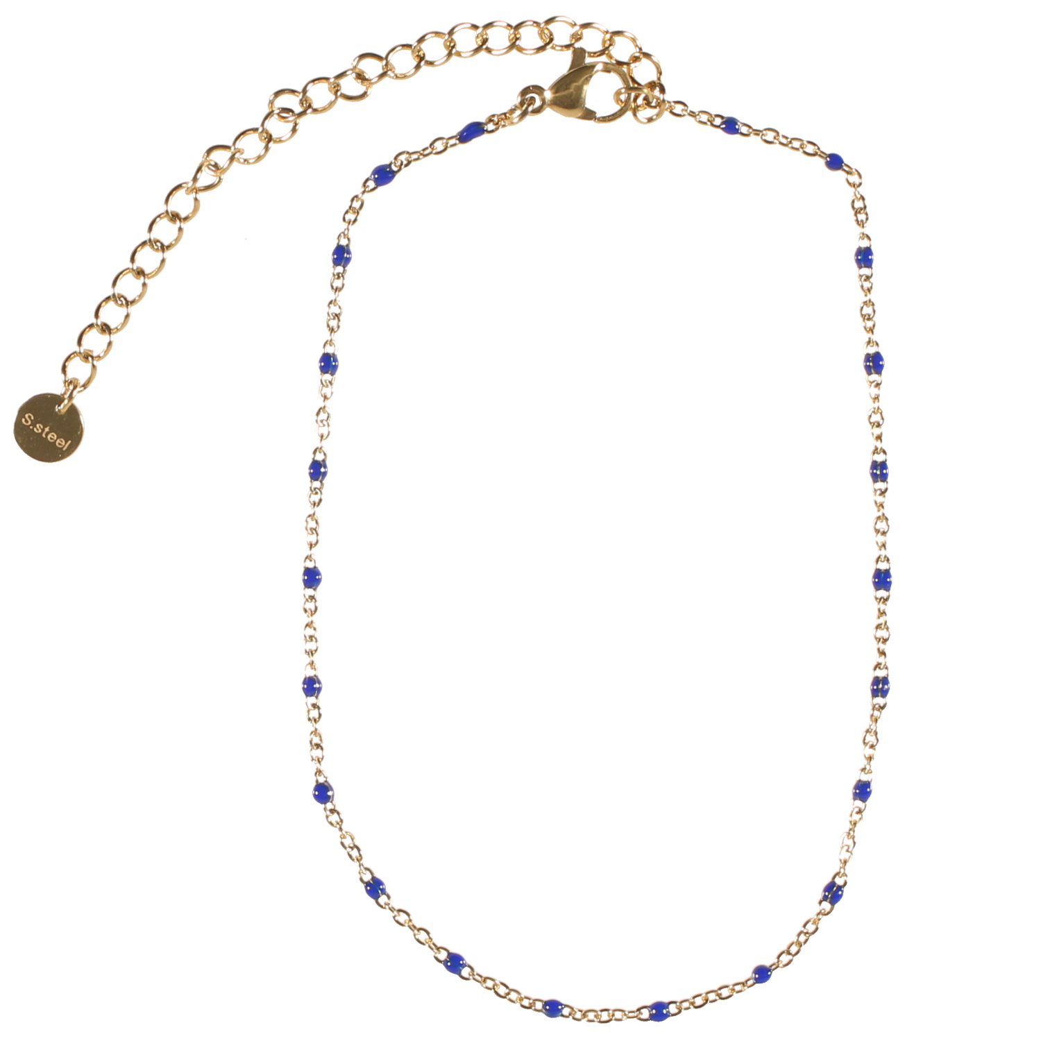 Description Bracelet chaîne de cheville composé d'une chaîne en acier doré et de perles en émail de couleur bleu. Fermoir mousqueton avec 5 cm de rallonge. Cliquez sur une matière, un thème, une couleur ou une collection pour voir tous les articles associés.
