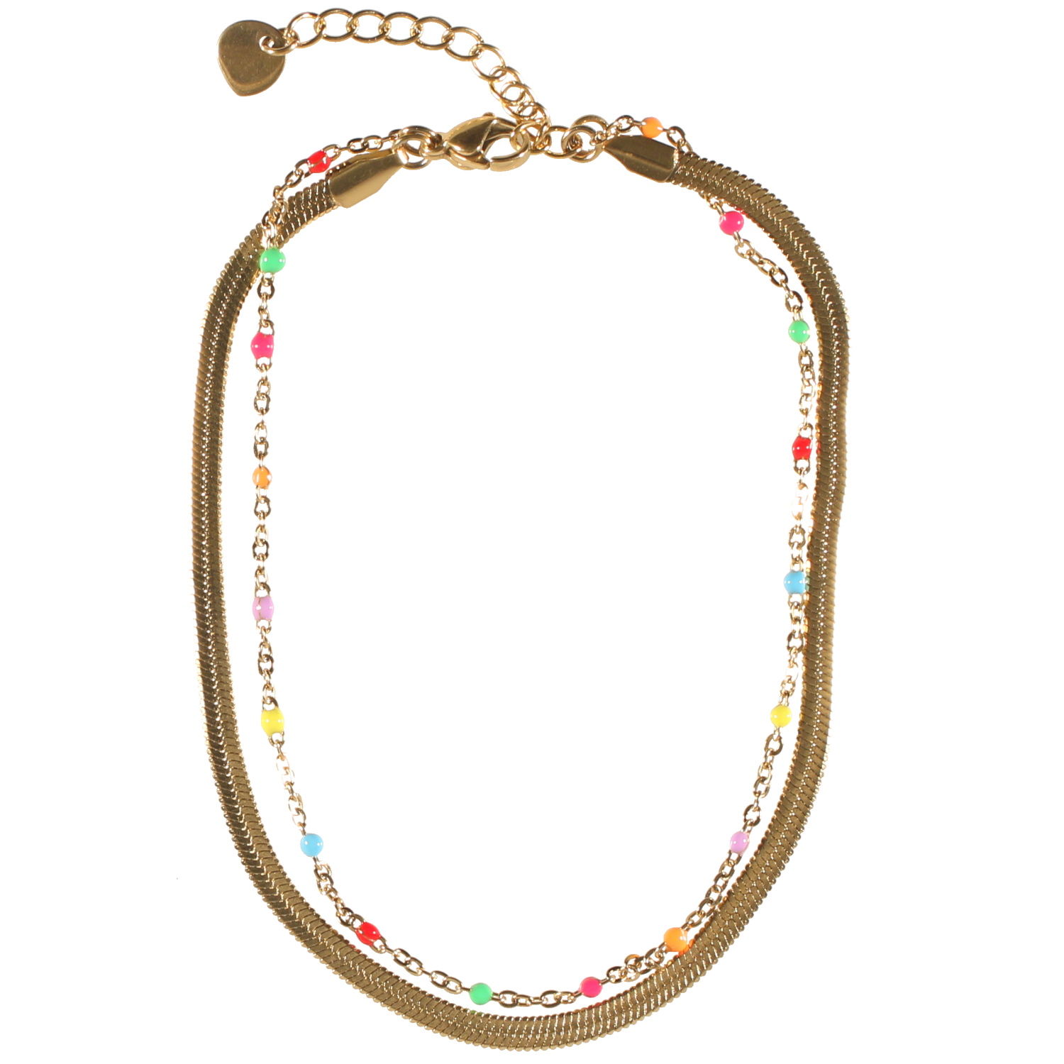 Description Bracelet chaîne de cheville double rangs composé d'une chaîne maille serpent en acier doré et d'une chaîne en acier doré avec perles en émail multicolore. Fermoir mousqueton avec 4 cm de rallonge. Cliquez sur une matière, un thème, une couleur ou une collection pour voir tous les articles associés.