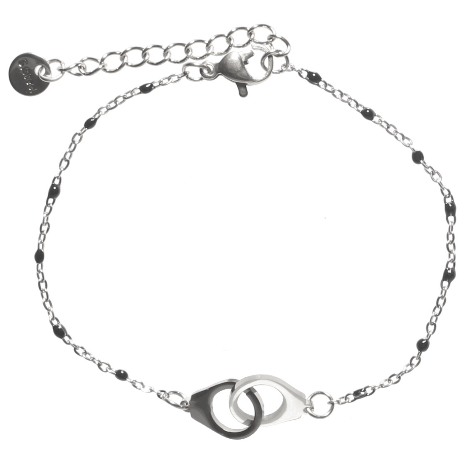 Description Bracelet composé d'une chaîne et d'une paire de menottes en acier argenté et de perles en émail de couleur noire. Fermoir mousqueton avec 3 cm de rallonge. Cliquez sur une matière, un thème, une couleur ou une collection pour voir tous les articles associés.
