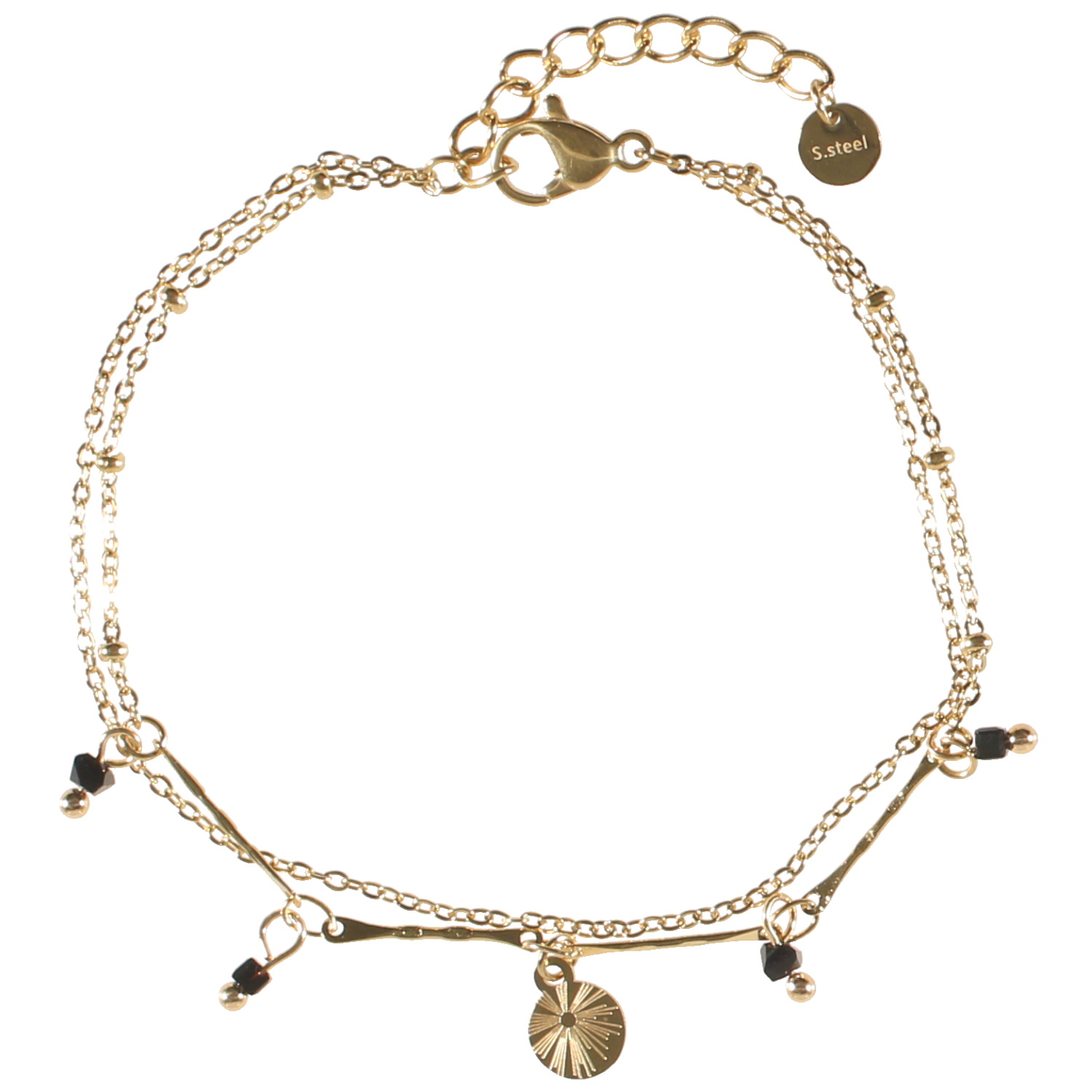 Bracelet double rangs composé d'une chaîne en acier doré et d'une chaîne avec une pampille ronde aux motifs de rayons en acier doré et pampilles perles en véritables pierre d'agate.