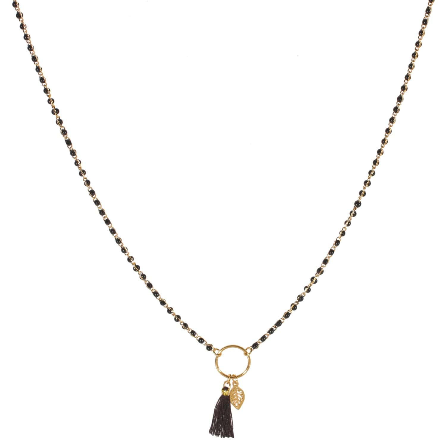 Collier avec pendentif cercle et feuille en acier doré, perles en émail de couleur noire et pompon en textile.