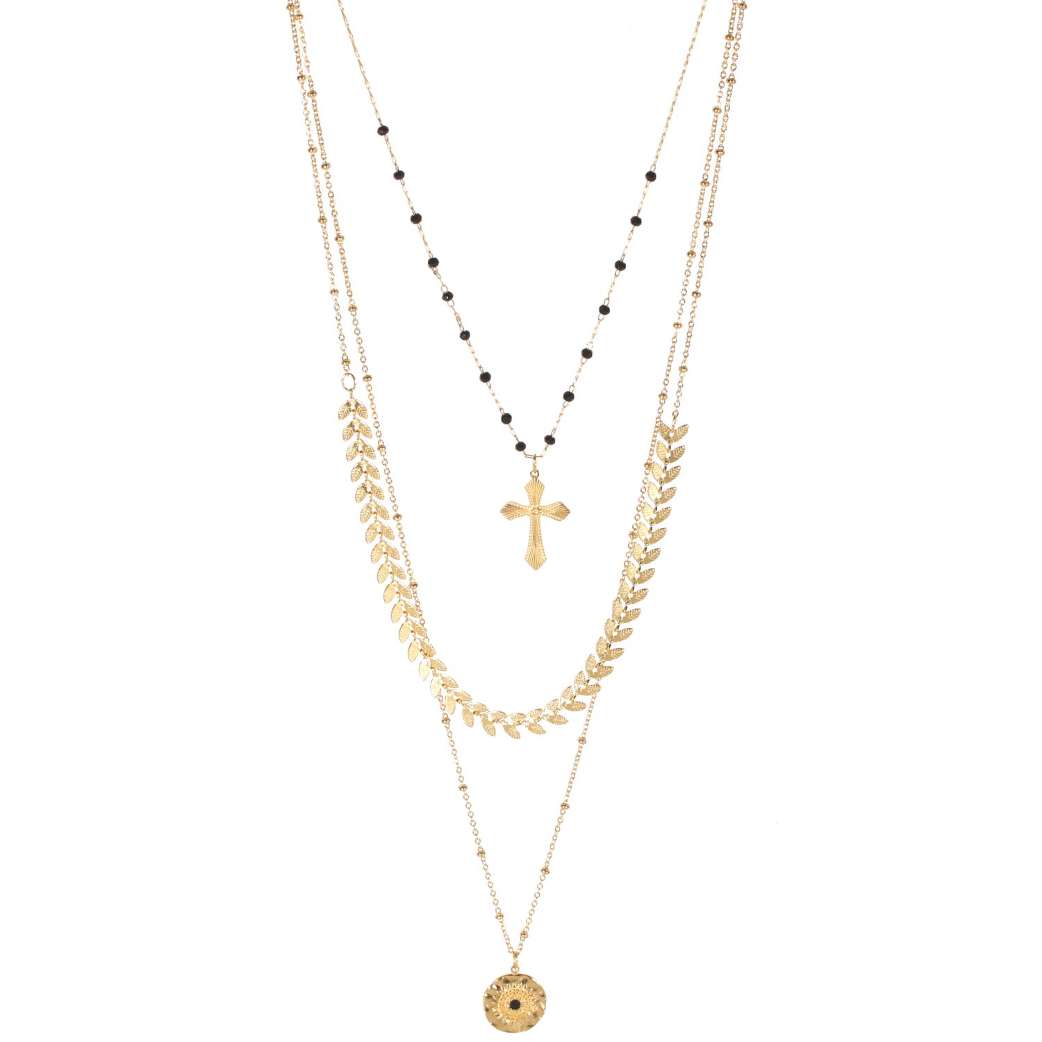 Collier triple rangs composé d'une chaîne de 40 cm de long avec un pendentif croix en acier doré et perles de couleur noire, une chaîne de 50 cm de long avec feuilles de laurier en acier doré, ainsi qu'une chaîne de 60 cm de long an acier doré avec pendentif rond martelé et motif de tournesol centré d'un point en émail de couleur noire.