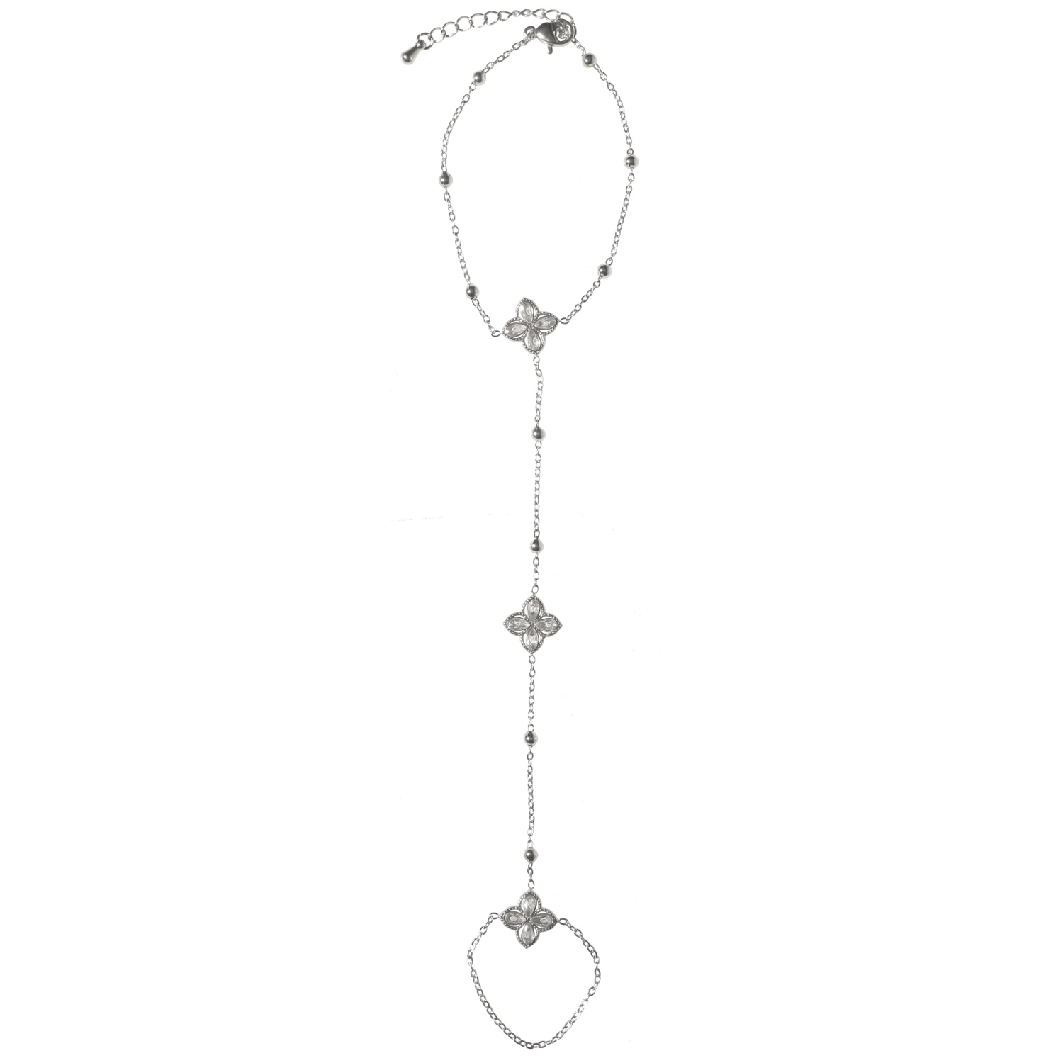 Bracelet composé d'une chaîne en acier argenté avec des trèfles sertis de strass et d'une bague chaîne.