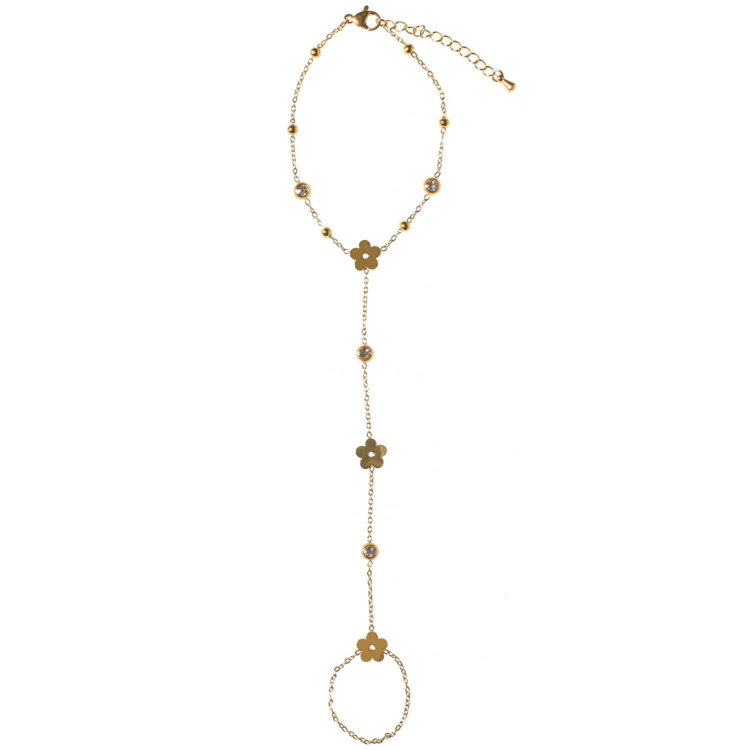 Description Bracelet composé d'une chaîne en acier doré avec des fleurs et des cristaux sertis clos et d'une bague chaîne. Fermoir mousqueton avec 3 cm de rallonge. Cliquez sur une matière, un thème, une couleur ou une collection pour voir tous les articles associés.